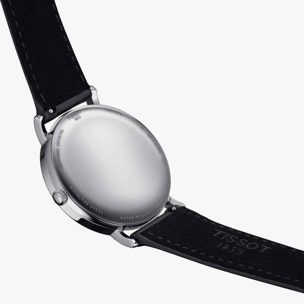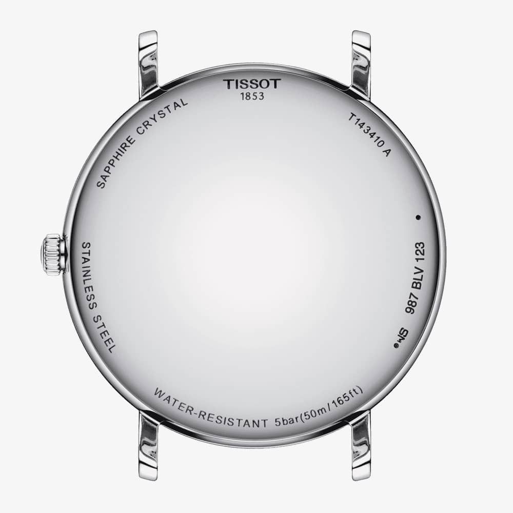 The Tissot Everytime Gent Blue Watch T143.410.16.041.00 combines a 40mm round-shaped stainless steel case and a black interchangeable embossed cow leather strap with a traditional buckle. It has a black-to-blue gradient sunray analogue dial with silver indexes and hands, protected beneath scratch-resistant sapphire crystal glass. Power is generated by the Swiss quartz movement with an end-of-life indicator. This model also has a water resistance of up to 50 metres.
