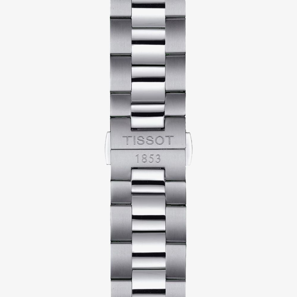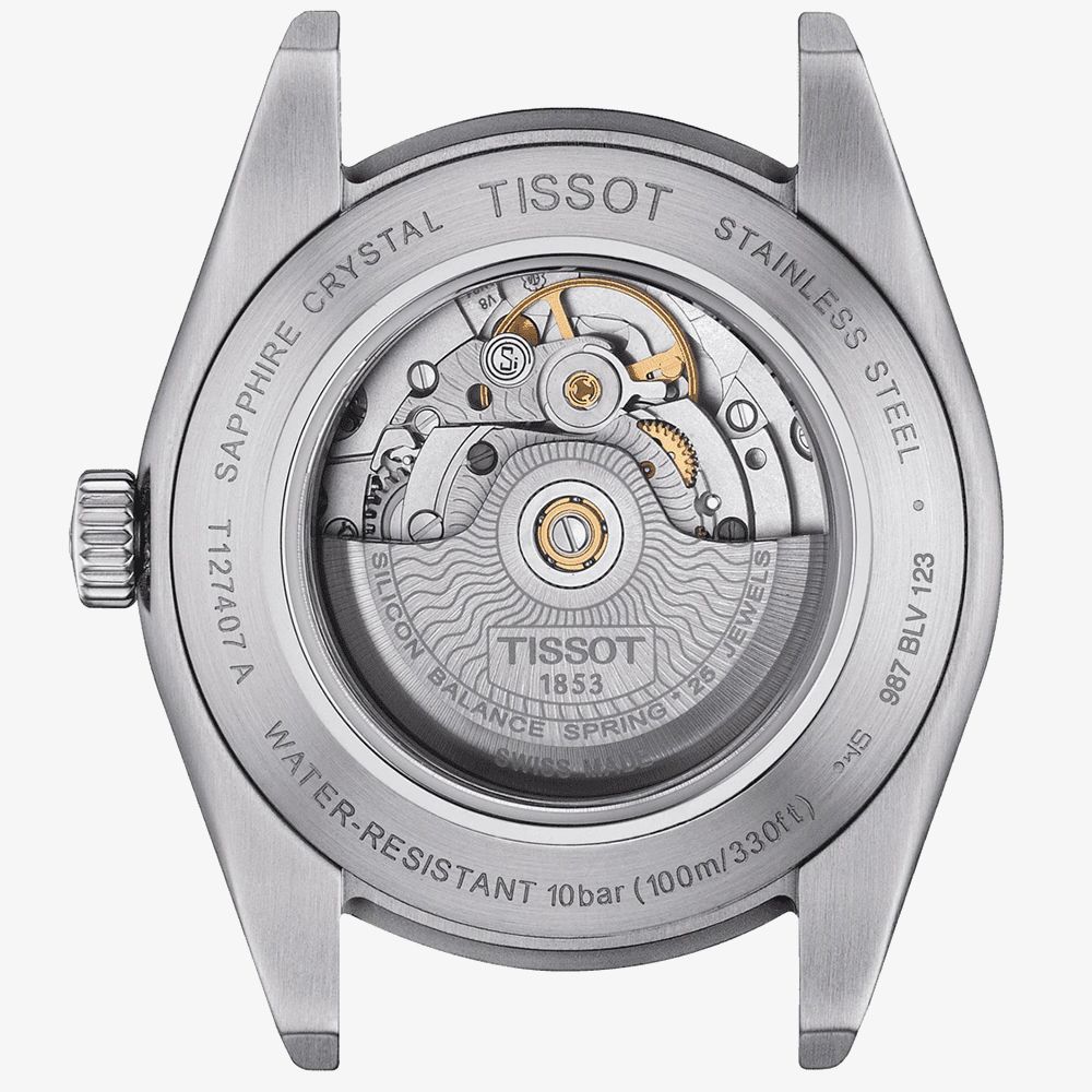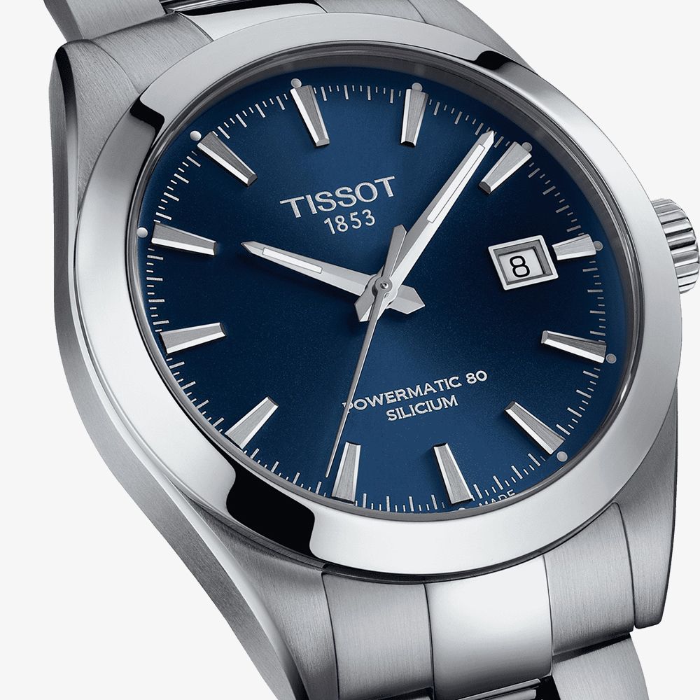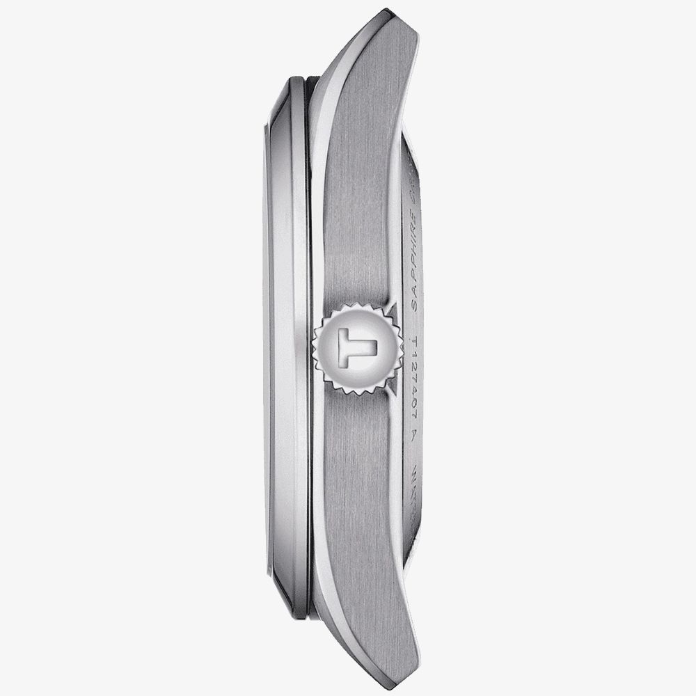 The Tissot T127.407.11.041.00 watch combines a 40mm round shaped stainless-steel case and 21mm wide silver stainless-steel bracelet with a push button deployment clasp. It has a blue analogue dial with luminescent hands, and a date display which is protected beneath domed scratch resistant sapphire crystal glass with anti-reflective coating. Power is generated by the POWERMATIC 80.11 automatic movement which can be seen through the sapphire crystal case back and has a power reserve of up to 80 hours. This model also has a water resistance of up to 100 metres.