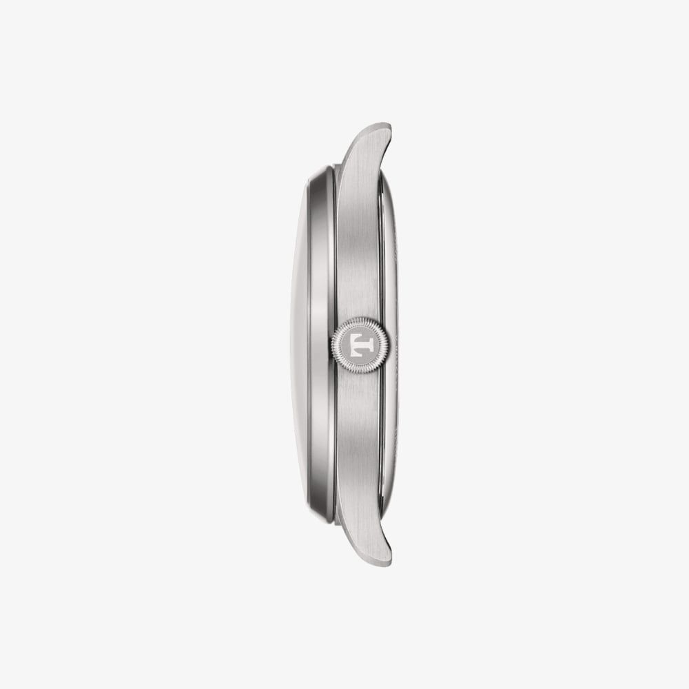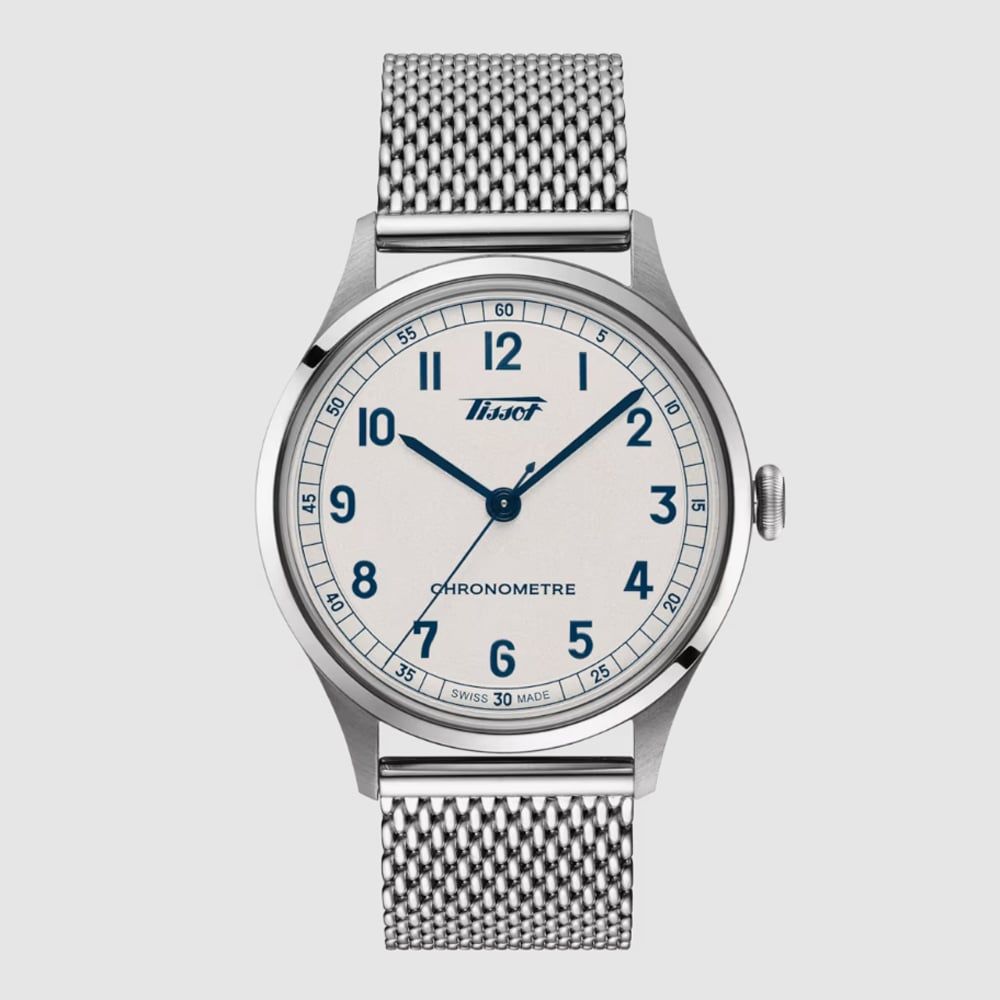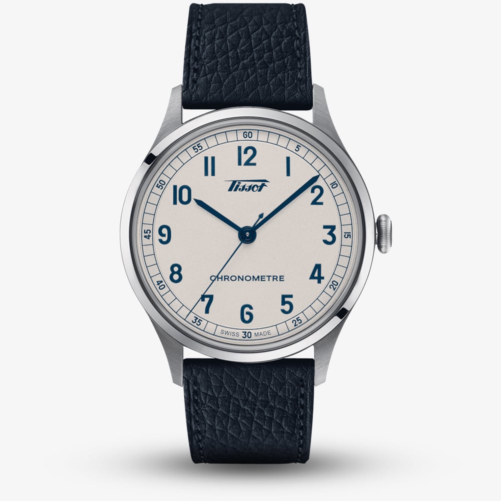 The Tissot Heritage Automatic 1938 evokes 1930s elegance with its vintage silver dial and blue Arabic numerals. An interchangeable dark blue-grained leather strap enhances versatility, while the 39mm size offers refined craftsmanship and timeless appeal.