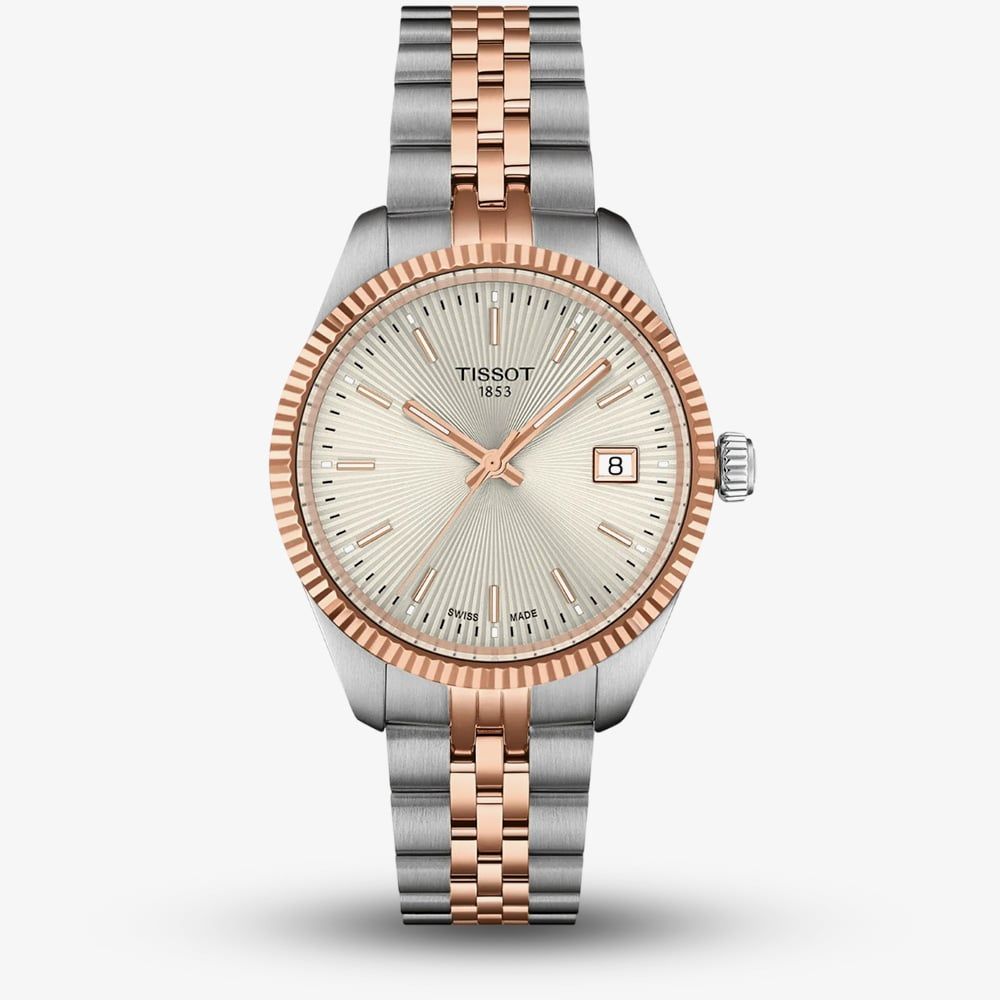The Tissot Ladies Ballade Two-Tone Silver and Rose Gold Bracelet Watch radiates timeless sophistication. Its silver guilloché dial with sunbeam rays beautifully reflects light, while the fluted rose gold bezel and two-tone stainless steel bracelet with rose gold PVD accents add elegance and warmth. Featuring Super-LumiNova® hands and hour markers for enhanced readability and a practical date window, this watch perfectly blends classic design with modern functionality, making it ideal for everyday wear or special occasions.