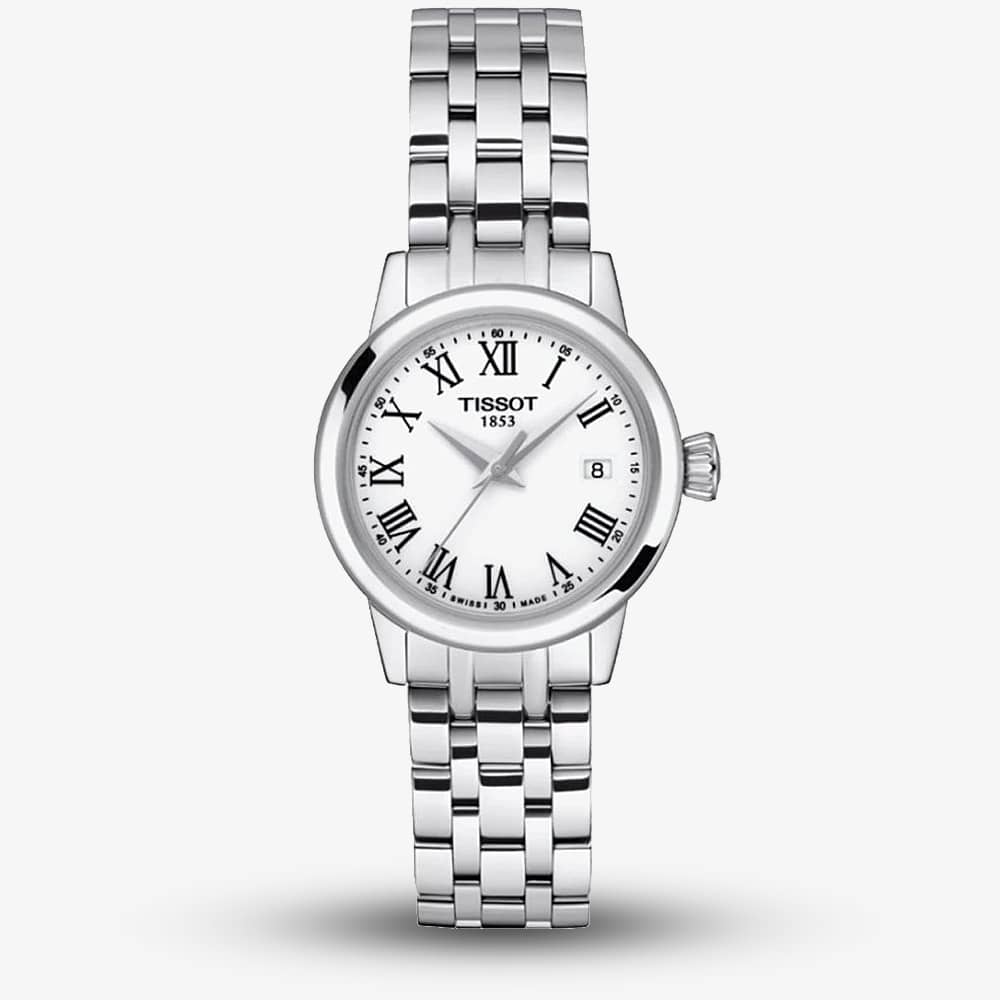 From Tissot's T-Classic collection, a classically elegant design crafted with a hard wearing stainless steel case and bracelet that features a white dial along with silver coloured hands and black roman numerals which are protected by a scratch resistant Sapphire Crystal glass. Additionally this model is powered by a Swiss quartz movement, features an easy to read date display and is 50 metres water resistant.