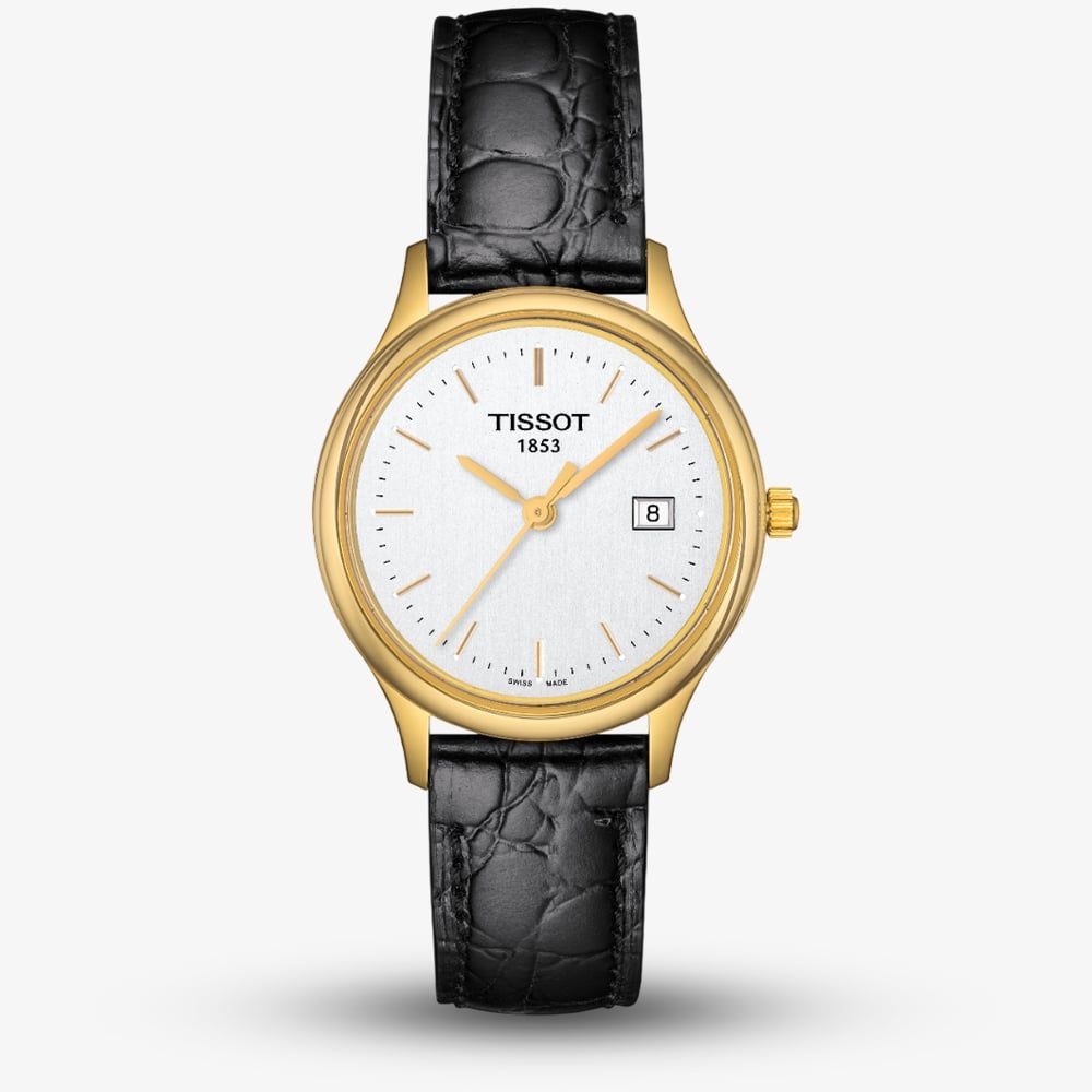 Embodying the quiet luxury of an 18K yellow gold case, this refined Swiss timepiece is a masterclass in petite, traditional design. The 27mm silhouette offers a delicate presence on the wrist, polished to a brilliant lustre that radiates warmth against the skin. It has a silver dial with a date display, gold hands, and gold baton hour markers. Model T913.210.16.031.01 is a perfect choice for the woman who values heritage and the enduring appeal of precious metals in a compact, feminine form.