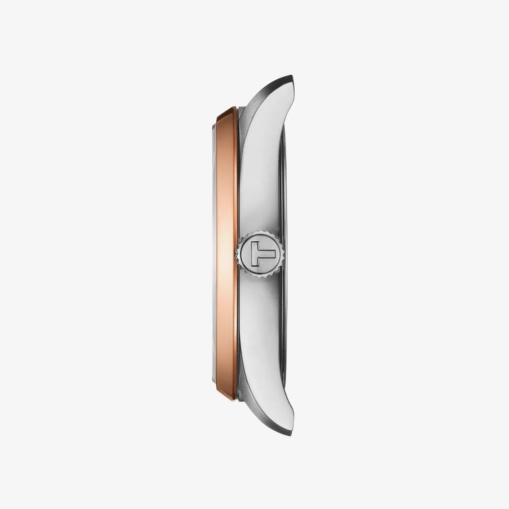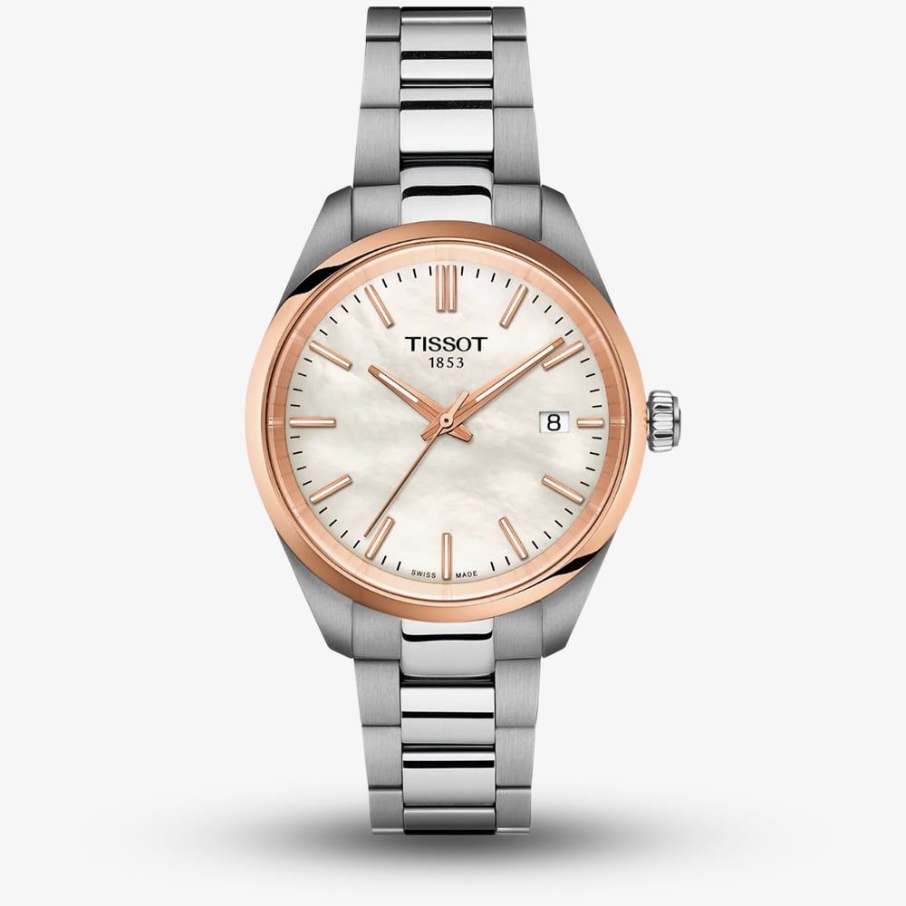 The Tissot PR 100 remains a best-seller for a reason: precise, robust, and water-resistant up to 100m. This feminine edition combines elegance with minimalism, featuring a 34mm stainless steel case with a rose gold PVD bezel and a luminous mother-of-pearl dial. SuperLuminova®-coated hands ensure easy reading even in the dark, while the classic stainless steel bracelet adds a subtle touch of chic. A refined timepiece that balances everyday functionality with sophisticated style.