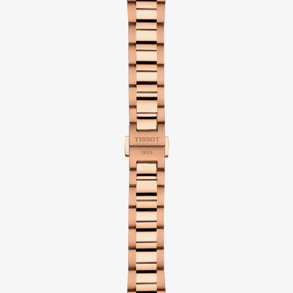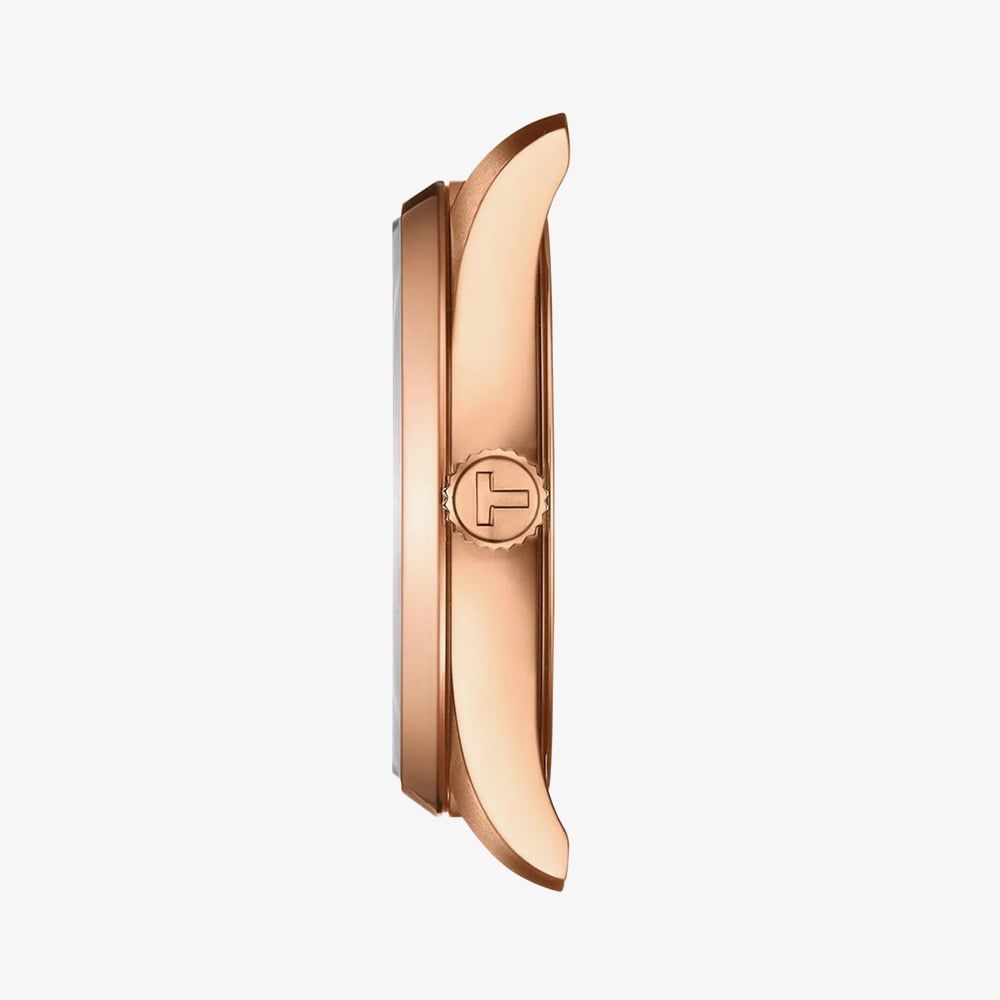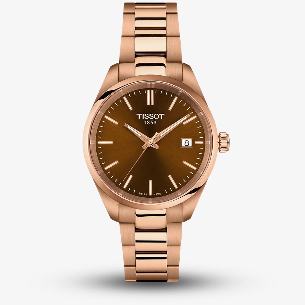 The Tissot PR 100, precise, robust, and water-resistant to 100 metres, is reinterpreted with a feminine, elegant flair. Its rose gold PVD case and bracelet complement a dark brown dial, while Super-LumiNova®-coated hands ensure clear visibility in any light. Combining timeless style with dependable performance, this watch is the perfect accessory for refined everyday wear.