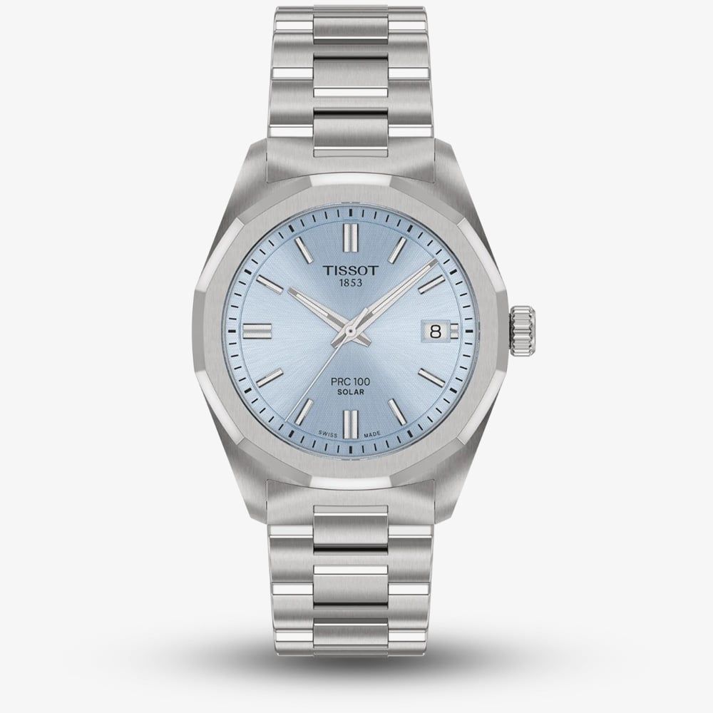 The Tissot PRC 100 Solar is a sleek and modern timepiece featuring a 34mm stainless steel case, bold dodecagonal bezel, and a striking ice blue dial. Powered by a solar quartz movement, it offers reliable, eco-friendly performance with a convenient date window at 3 o’clock. Super-LumiNova® hands and hour markers ensure excellent visibility in all lighting conditions, making this watch both stylish and functional for everyday wear.