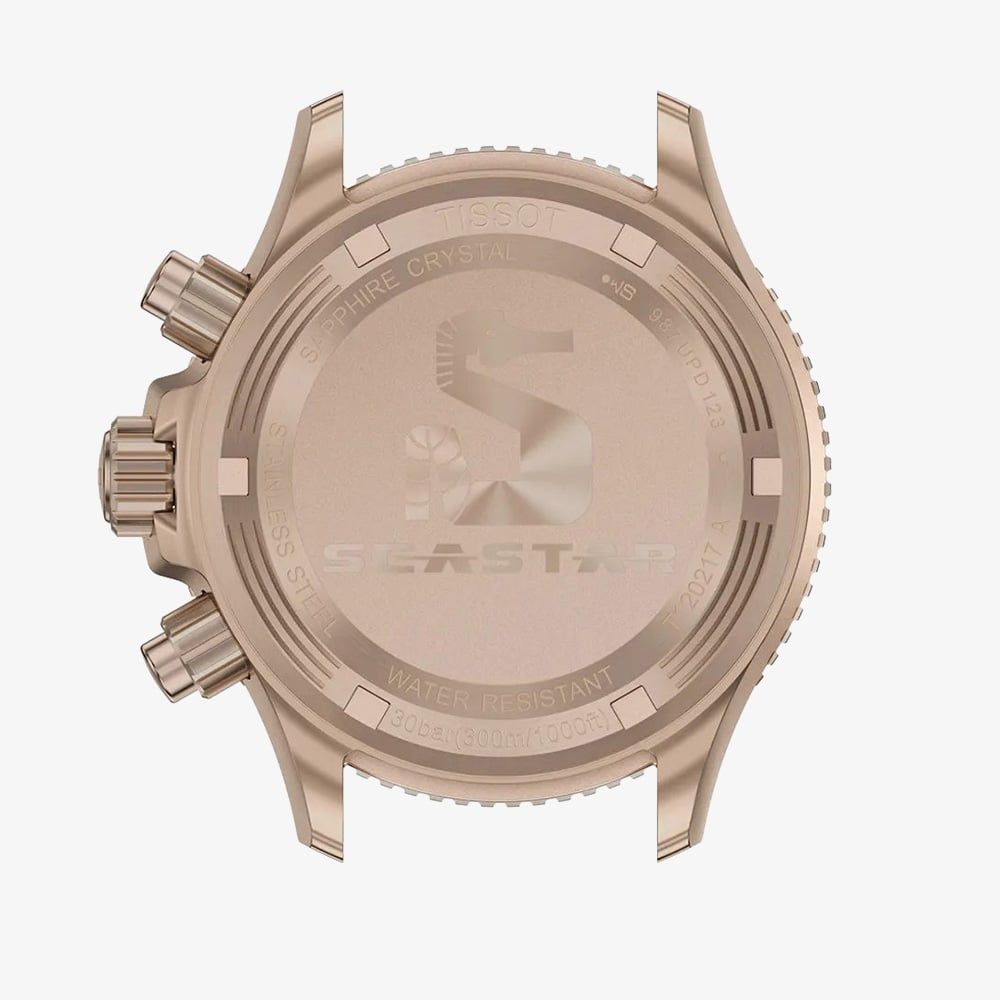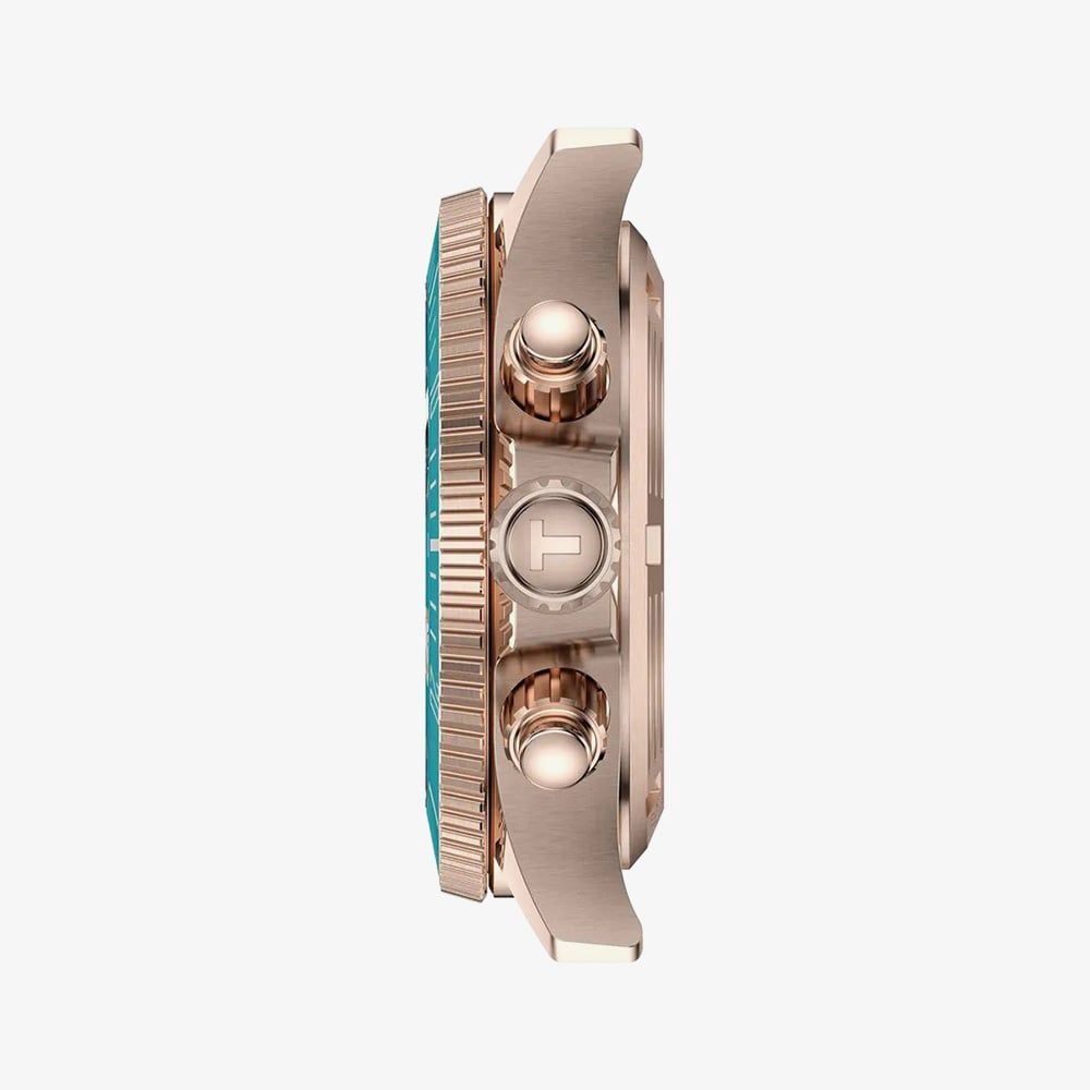 The Tissot Seastar 1000 Quartz Chronograph is a bold fusion of style and performance, designed for underwater exploration and everyday wear. Featuring a vibrant turquoise dial, strap, and unidirectional bezel, this eye-catching timepiece is housed in a durable stainless steel case with carnation gold PVD plating for a touch of luxury. Equipped with a precise quartz chronograph movement, it offers reliable timekeeping and stopwatch functionality. With Super-LumiNova® hands and hour markers for enhanced visibility and an impressive 300-metre water resistance, the Seastar 1000 is built to perform wherever adventure takes you.