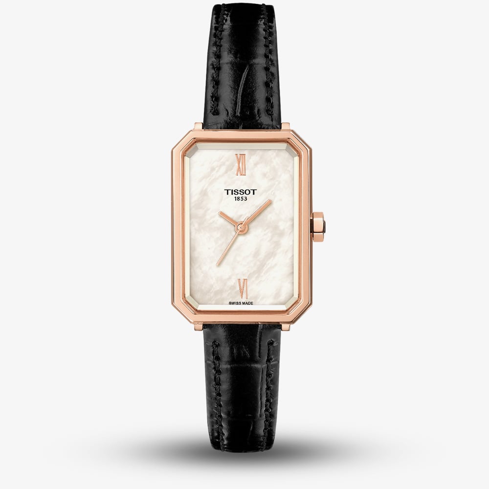 Marking the 100th anniversary of Art Deco, the Tissot SRV Ladies Watch is a refined blend of vintage inspiration and modern craftsmanship. Drawing from Tissot’s 1920s heritage, it features a sleek angular case in beige gold PVD plated stainless steel, a luminous mother-of-pearl dial, and a classic black leather strap. The distinctive hexagonal crown adds a subtle geometric touch, while a precise quartz movement with end-of-life indicator ensures reliable performance. Elegant and distinctive, it captures the spirit of a timeless design era.
