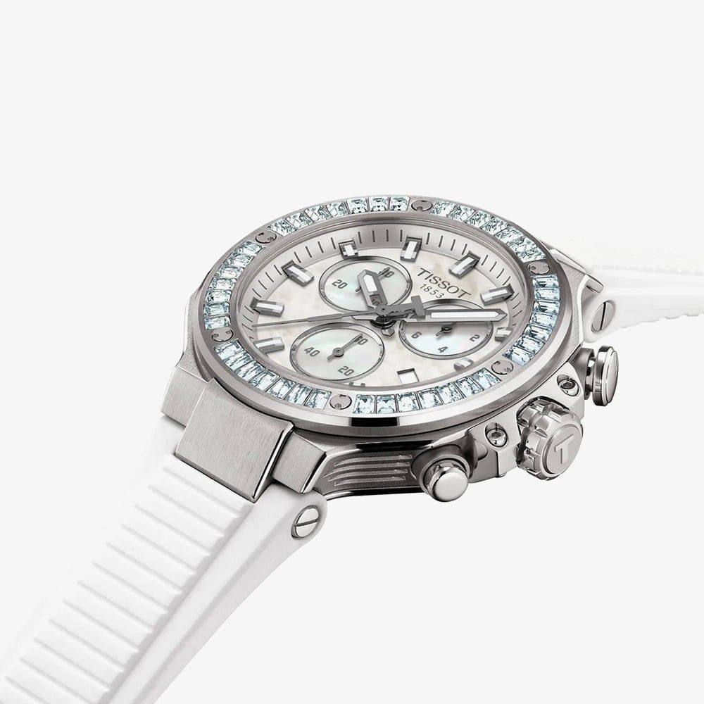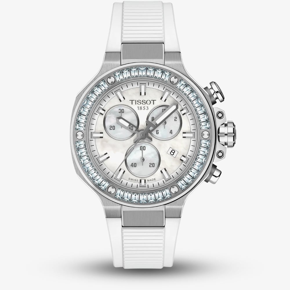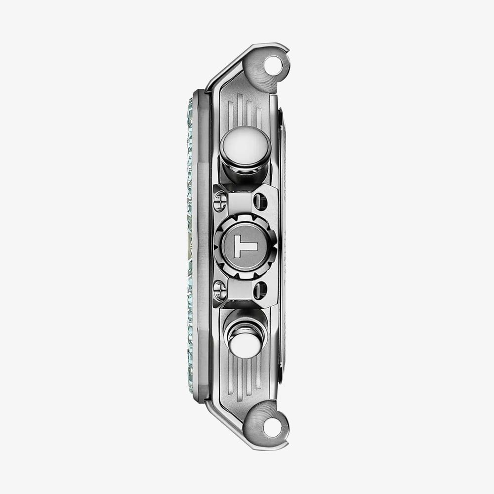 Driven by a precise quartz chronograph movement, the 38mm Tissot T-Race Chronograph captures the adrenaline of motorcycle racing in a bold, compact design. Inspired by Tissot’s deep connection to the sport, this watch features dynamic elements like a brake disc-style bezel, handlebar-shaped pushers, and engine-like cooling fins on the case. Crafted from robust 316L stainless steel with a matching bracelet and a push-piece safety folding clasp, it combines strength and flexibility.
