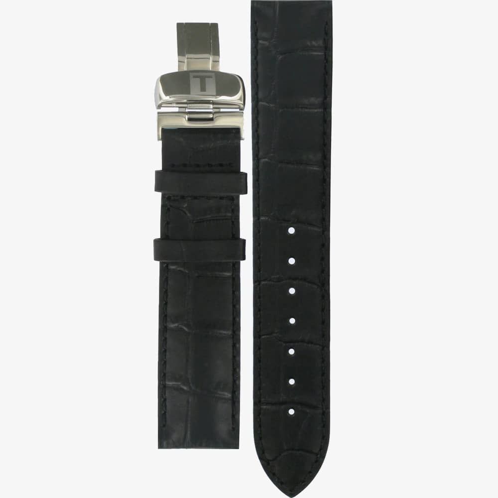 A Tissot Le Locle watch strap measuring 19mm wide and made from black alligator leather with a stainless steel clasp.