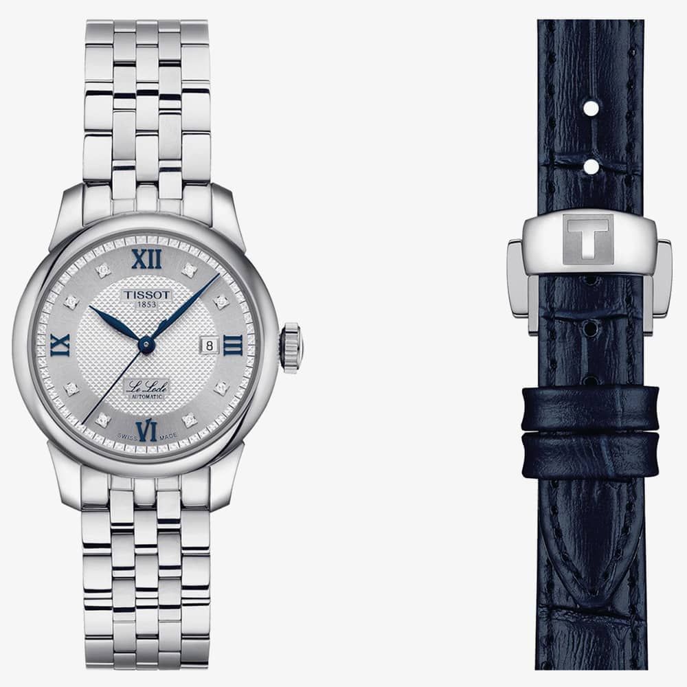 This chic and versatile timepiece has a silver dial with diamond indices exuding elegance. It comes with an extra navy-blue leather strap for easy outfit coordination. Elevate your style with this stunning and functional accessory.