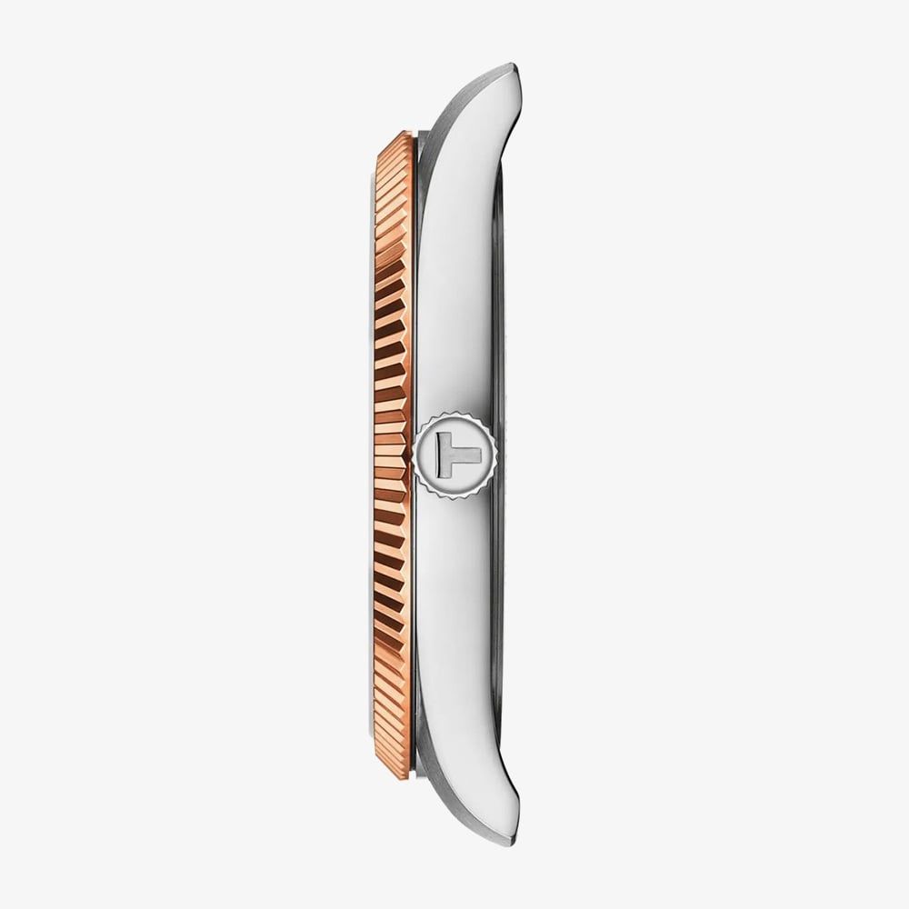 The Tissot Men’s Ballade Brown Dial Two-Tone Bracelet Watch exudes refined elegance. Its brown guilloché dial with sunbeam rays beautifully catches the light, framed by a rose gold PVD fluted bezel. The two-tone stainless steel bracelet, combining grey steel with rose gold PVD accents, completes the sophisticated look, making this timepiece a perfect blend of classic style and modern refinement.