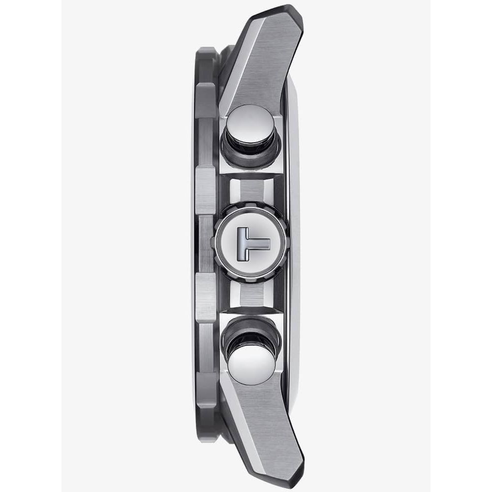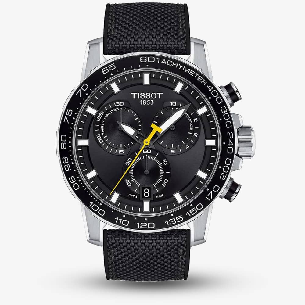 The Tissot T125.617.17.051.02 watch combines a 46mm round shaped stainless-steel case and black leather strap with textile detailing and a traditional buckle. It has a black analogue dial with two black luminescent hands with a yellow second tracker. Date is visible at position 6 with black chronograph sub dials and a tachymeter scale on the bezel, which is protected beneath sapphire crystal glass. Power is generated by the quartz movement. This model also has a water resistance of up to 100 metres.