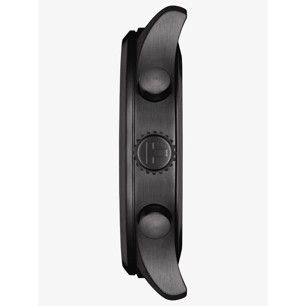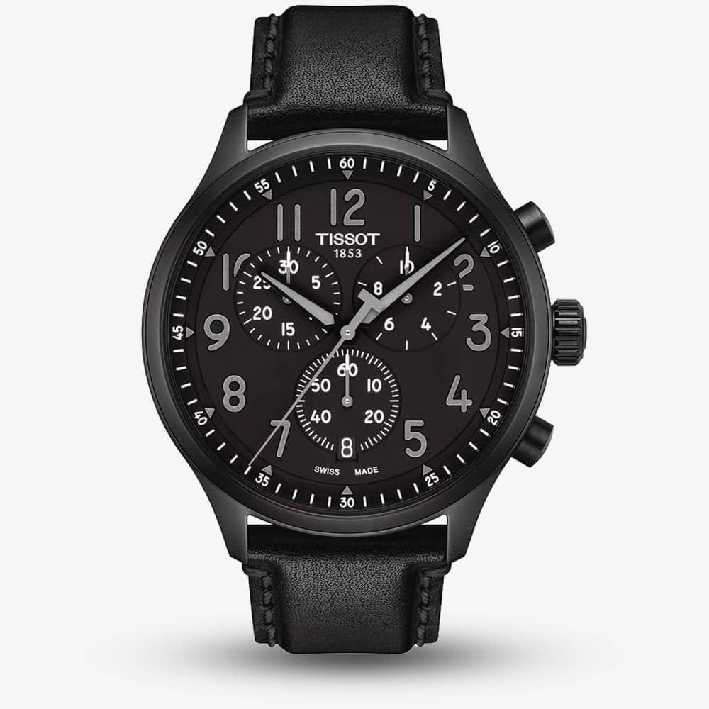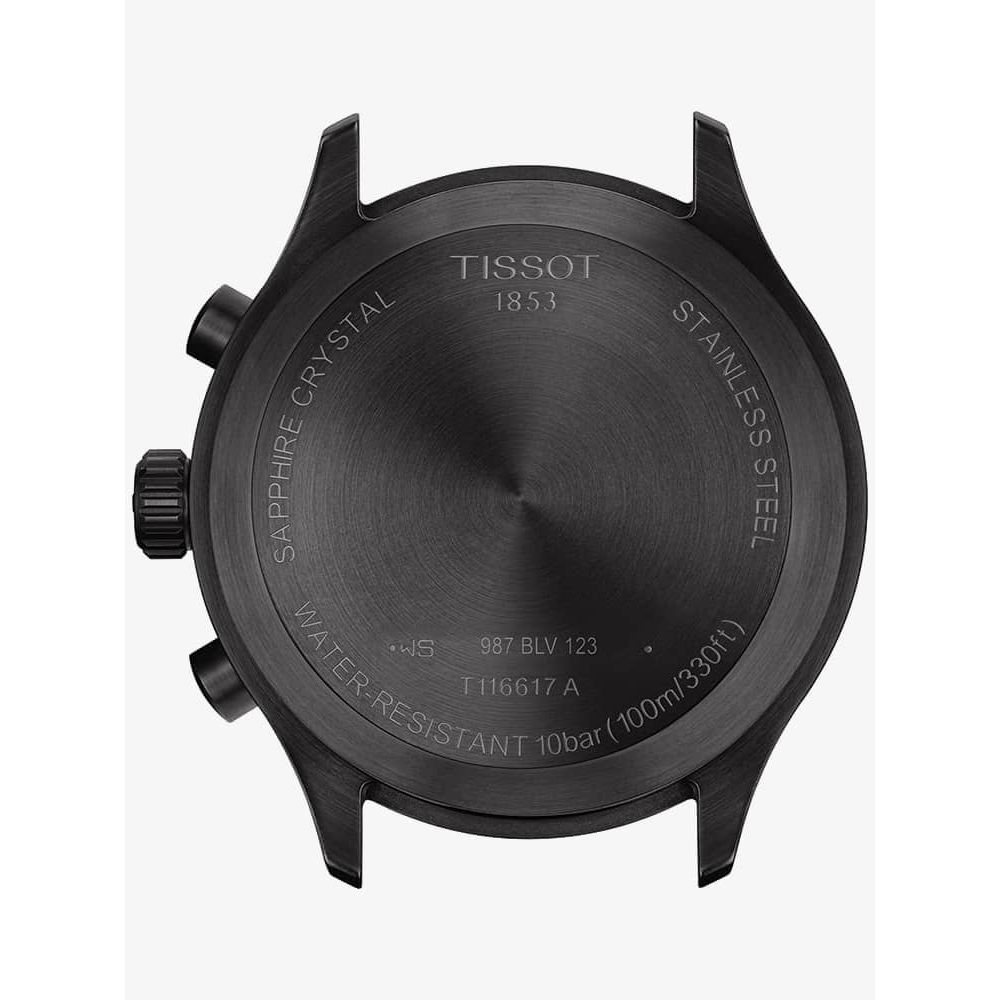 The Tissot T116.617.36.052.00 watch combines a black 45mm round shaped stainless-steel case and black leather strap with a traditional buckle. It has a black analogue dial with two black luminescent hands and a second tracker. Date is visible at position 6 with black chronograph sub dials which are protected beneath sapphire crystal glass. Power is generated by the quartz movement. This model also has a water resistance of up to 100 metres.