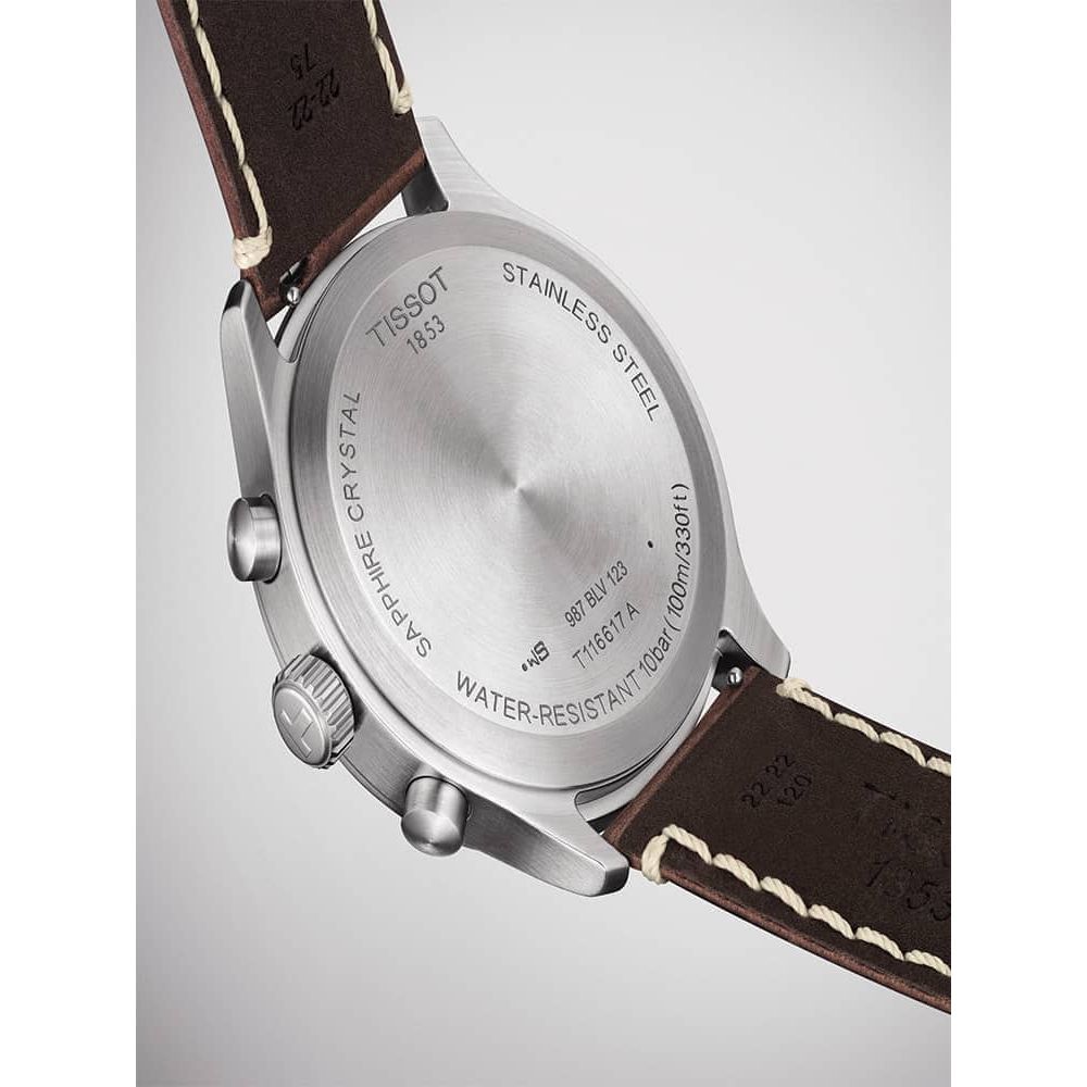 The Tissot T116.617.16.042.00 watch combines a 45mm round shaped stainless-steel case and brown leather strap with a traditional buckle. It has a dark blue analogue dial with two black luminescent hands and a second tracker. Date is visible at position 6 with dark blue chronograph sub dials which are protected beneath sapphire crystal glass. Power is generated by the quartz movement. This model also has a water resistance of up to 100 metres.