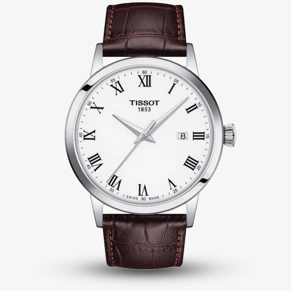 From Tissot's T-Classic collection, an elegant design crafted with a hard wearing stainless steel case featuring a white dial along with silver coloured hands and black roman numerals which are protected by a scratch resistant Sapphire Crystal glass. Additionally this model is powered by a Swiss quartz movement and is finished with a brown leather strap which complements it perfectly.