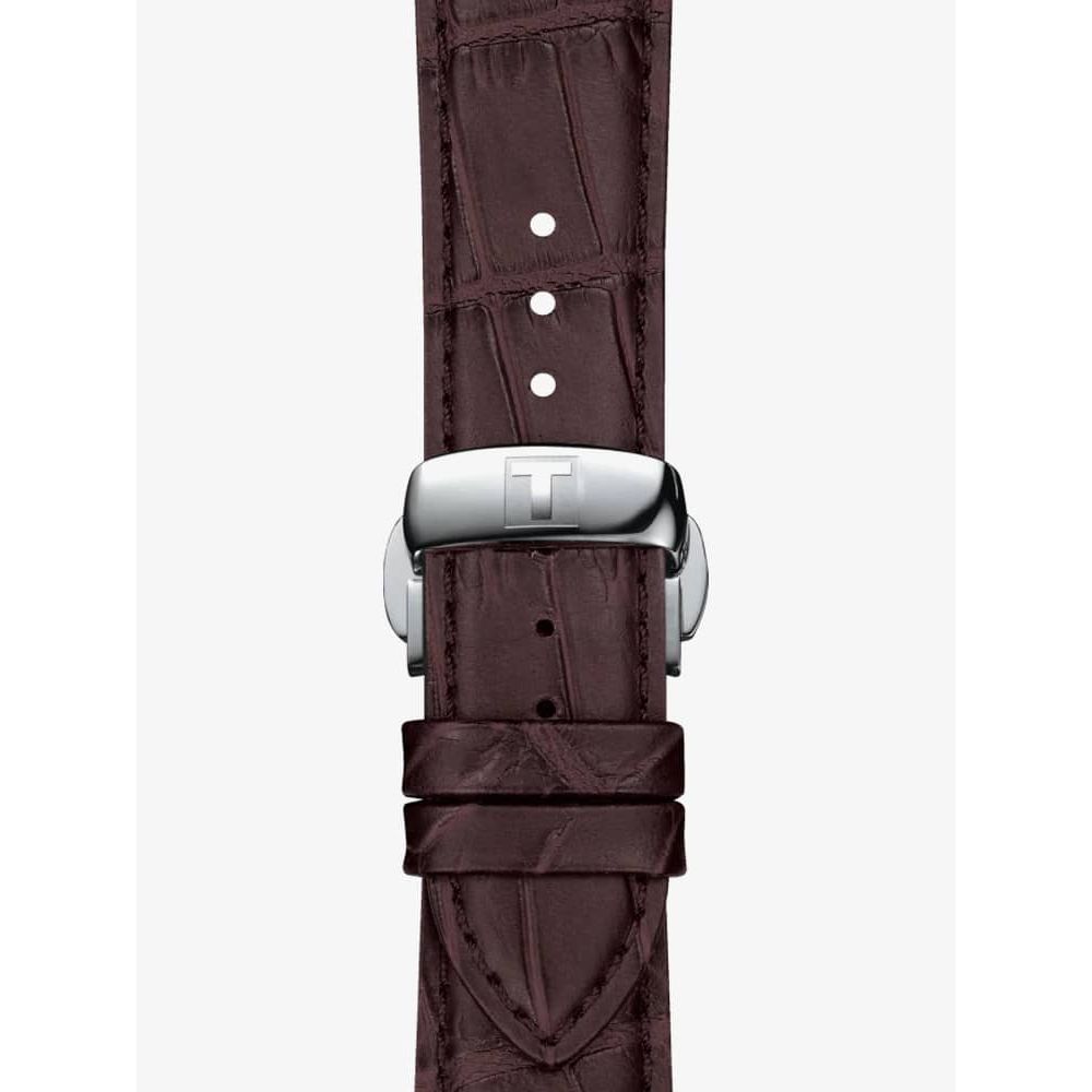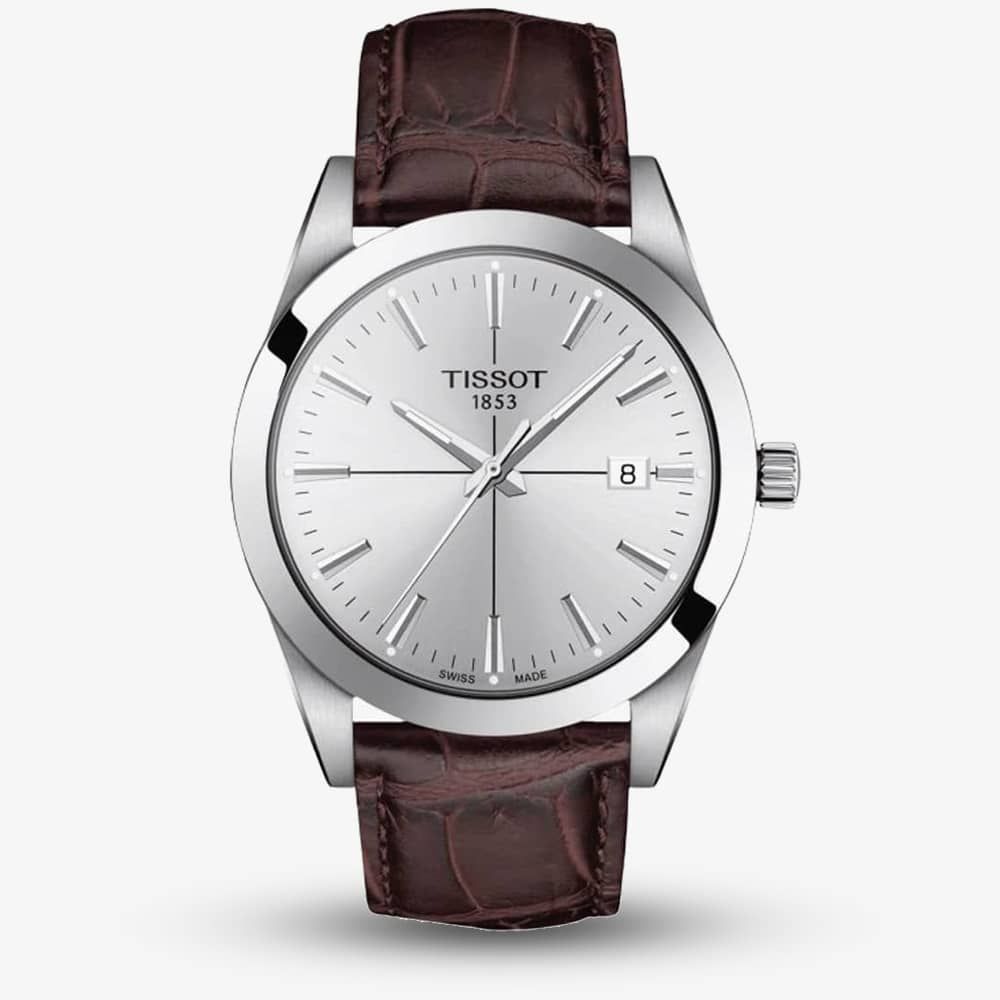 The Tissot T127.410.16.031.01 T-Classic watch combines a 40mm round-shaped stainless-steel case and brown alligator-style grained cowhide leather strap with a traditional buckle. It has a silver analogue dial with two silver luminescent hands with a silver second tracker. The date is visible at position 3, which is protected beneath domed, scratch-resistant sapphire crystal glass. Power is generated by the Swiss quartz movement. This model also has a water resistance of up to 100 metres.
