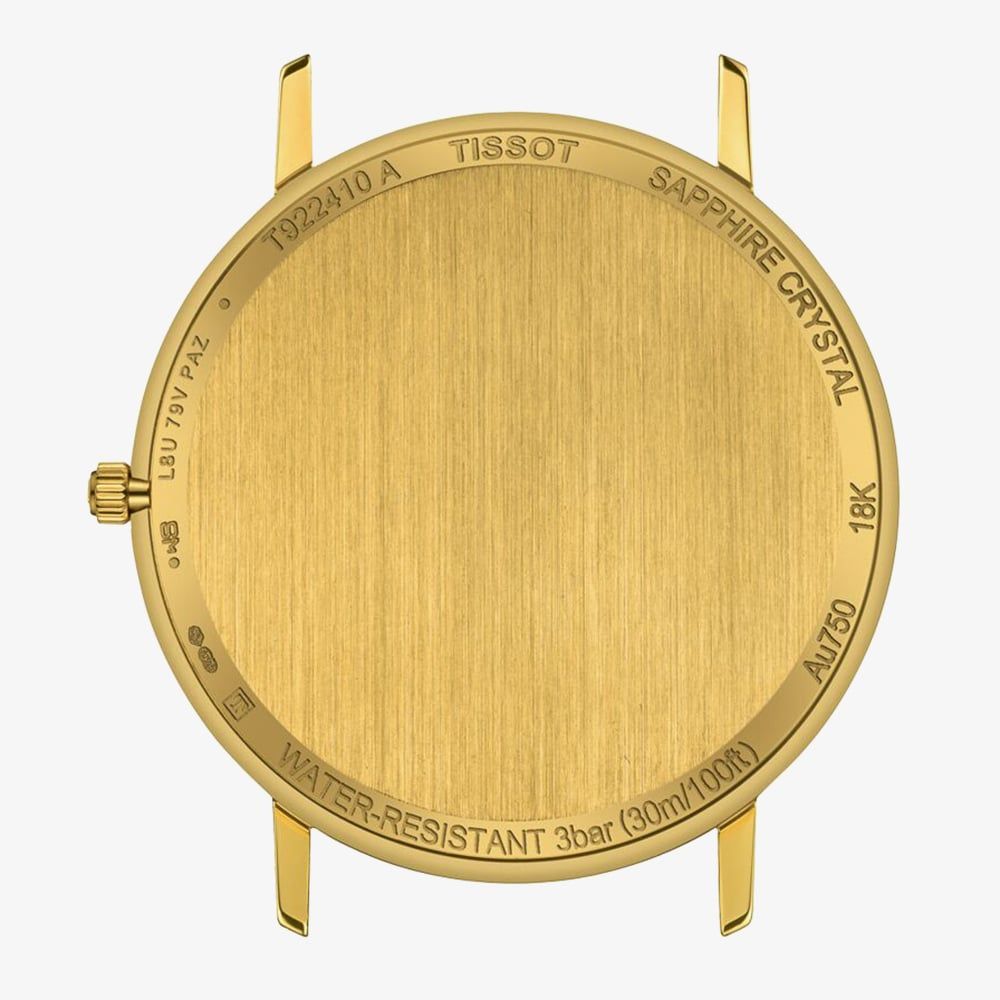 The Tissot Goldrun T922.410.16.021.00 is a masterclass in understated luxury, offering an incredibly slim profile that sits with effortless grace against the wrist. Crafted from solid 18ct yellow gold, the 38mm case possesses a soft, radiant glow that perfectly complements the champagne dial and its traditional stick indexes. At a mere 4.9mm thick, it is one of the most slender timepieces in the collection, designed specifically for the discerning wearer who values subtlety over excess.