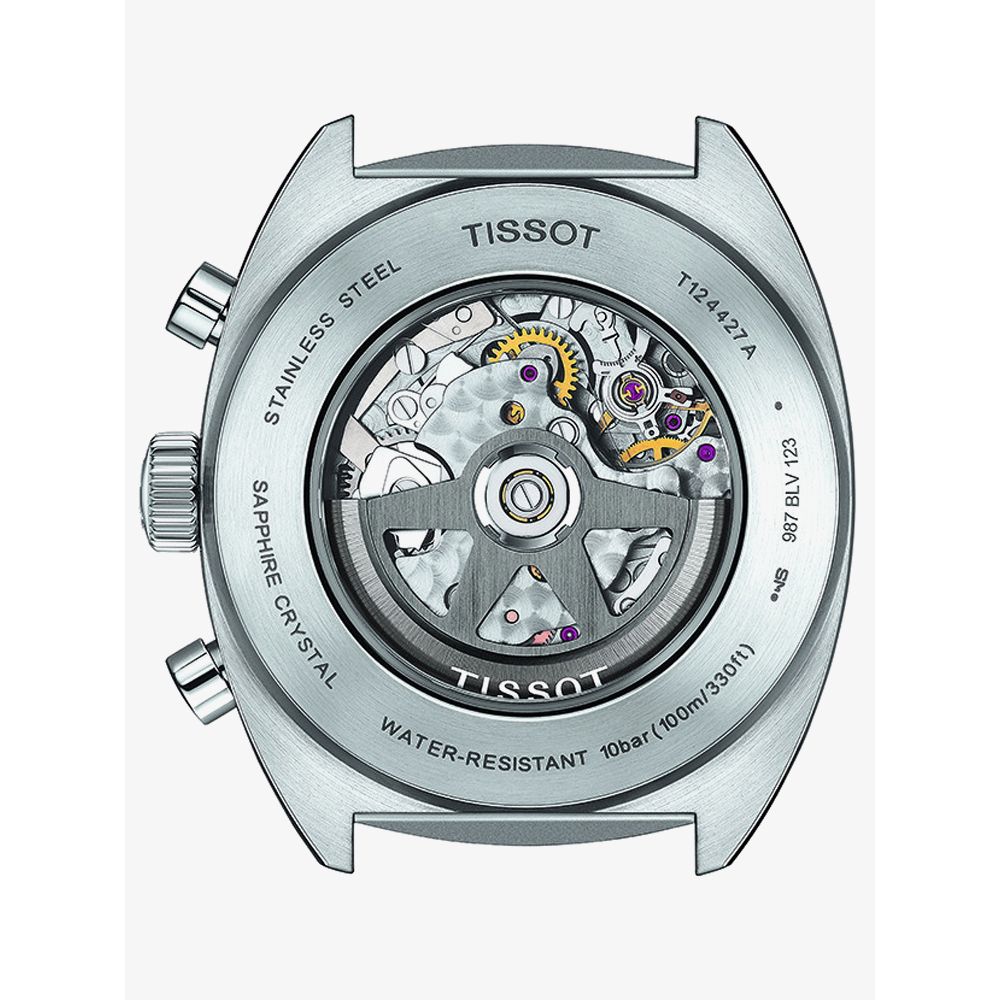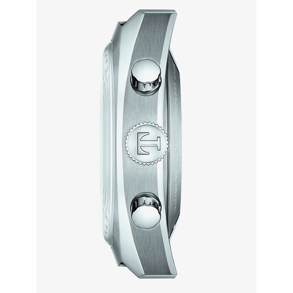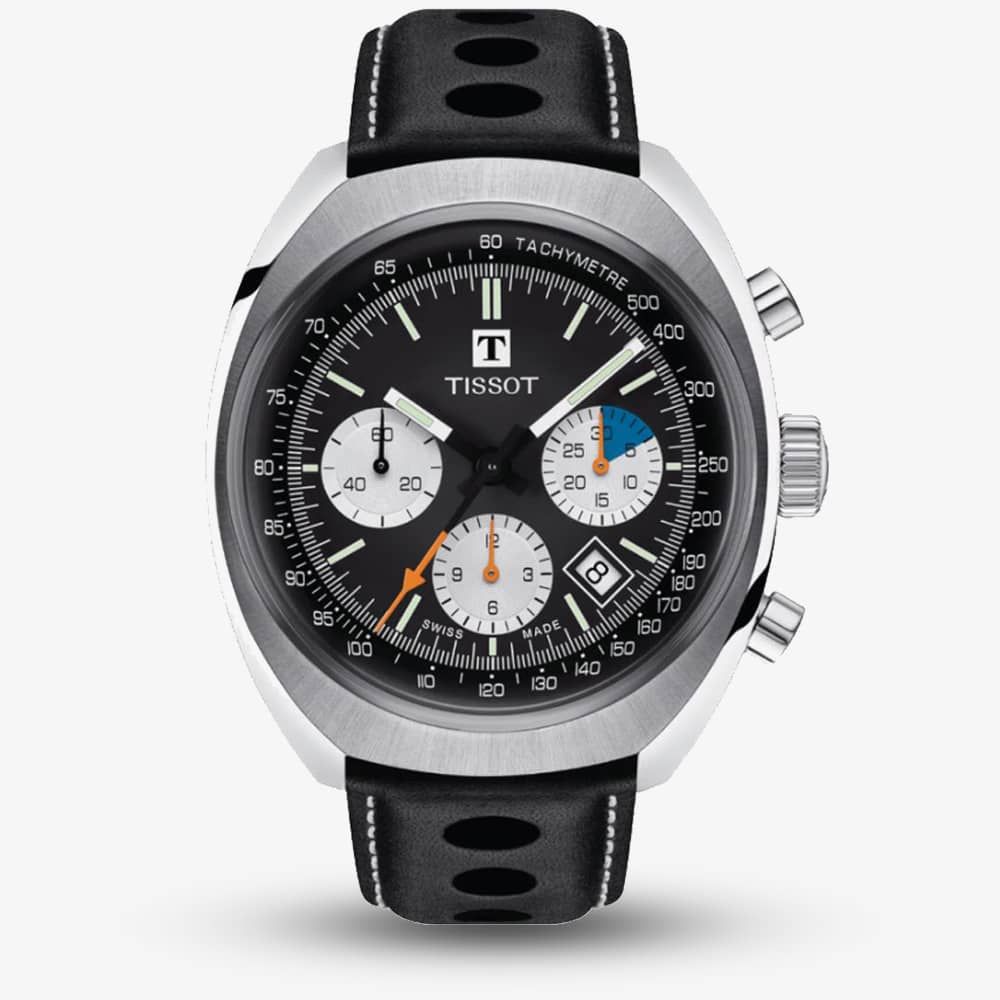 From Tissot's Heritage collection, a traditional design crafted with a hard wearing stainless steel round shaped case featuring a black and silver chronograph dial with luminous hands and indexes which are protected by a scratch resistant domed Sapphire Crystal glass with an anti-reflective coating. Additionally this model is powered by a Swiss Tissot automatic movement with a power reserve of up to 60 hours which can be admired through the transparent case back.