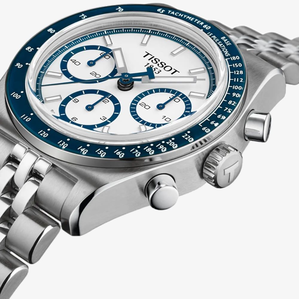 A blend of vintage inspiration and modern precision. With a robust stainless steel case and bracelet, this timepiece features a striking white and blue chronograph dial that enhances its sporty yet elegant appeal. The automatic movement ensures reliable performance, while the chronograph function provides precision timing for those who value functionality. Luminous hands and indices offer excellent readability, and the tachymeter scale adds a dynamic touch. With a perfect balance of heritage, innovation, and Swiss craftsmanship, this watch is an exceptional choice.