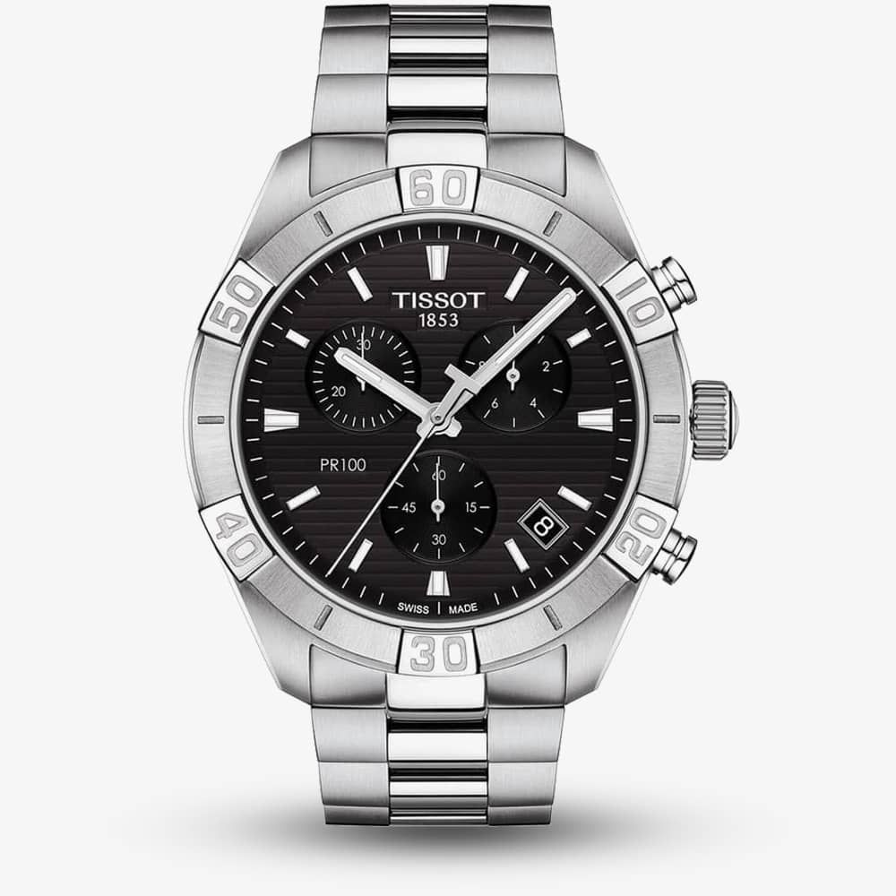 The Tissot T101.617.11.051.00 PR100 Sport Chronograph watch from the T-Classic collection combines a stainless steel case and bracelet with a double push button clasp. It has luminescent hands, chronograph sub-dials, and a date display which are protected beneath domed scratch resistant sapphire crystal glass. Powering the watch is a Swiss quartz movement with 4 jewels and an end of life indicator. This model also has a water resistance of up to 100 metres (330 ft/10 bar of pressure) and weighs 169 grams.