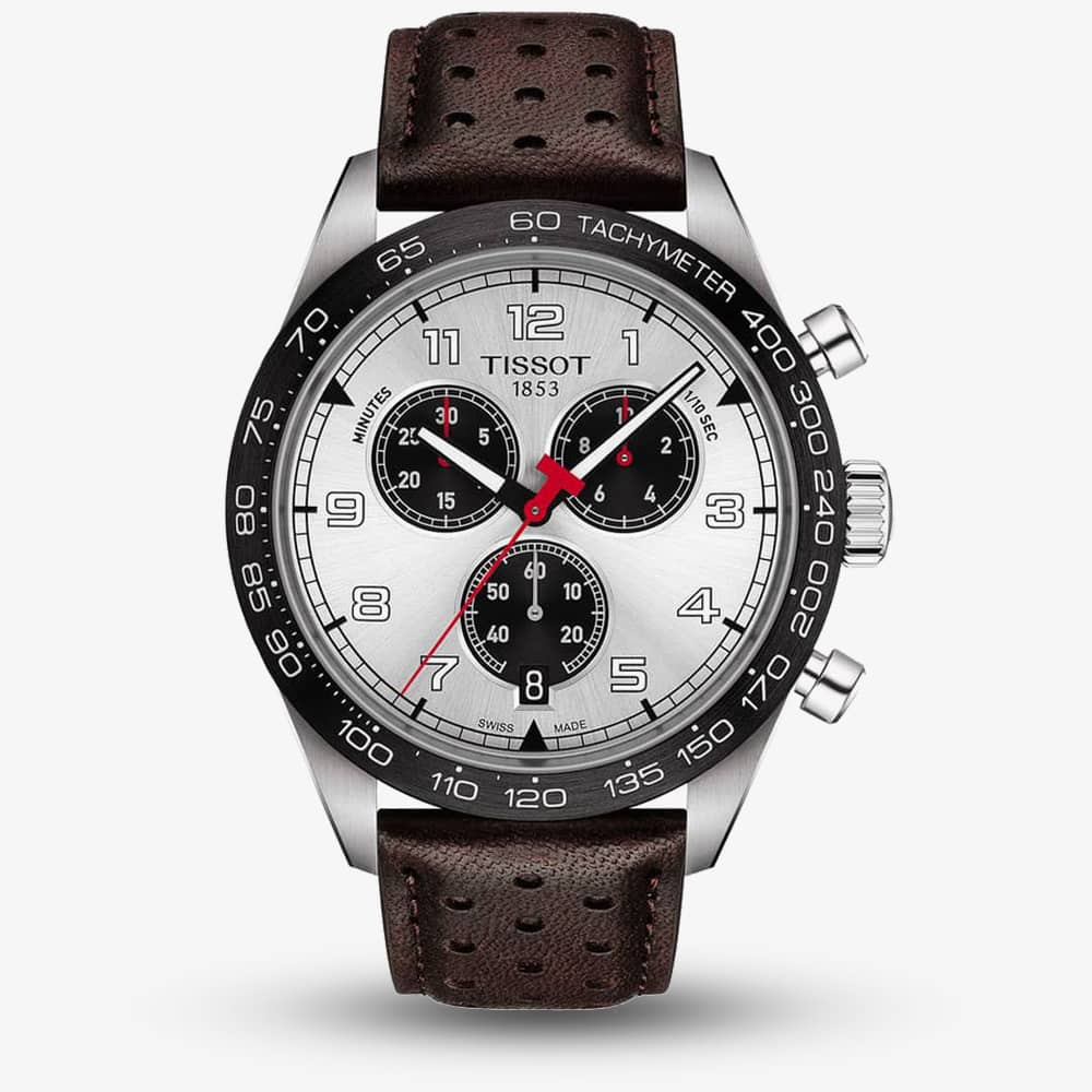 The Tissot T131.617.16.032.00 T-Sport PRS 516 watch is inspired by classic motorsport cars and the chronograph push buttons are modelled after engine pistons. It combines a 45mm round shaped black PVD coated stainless steel case and brown perforated leather strap with a butterfly clasp and push buttons. It has a silver analogue dial with luminescent hands, a date display, and chronograph sub-dials, all of which is protected beneath scratch resistant sapphire crystal glass. Power is generated by the Swiss made Calibre 13 ¼’” quartz movement with 4 jewels and an end of life indicator. This model also has a water resistance of up to 100 metres (330ft / 10 bar pressure).