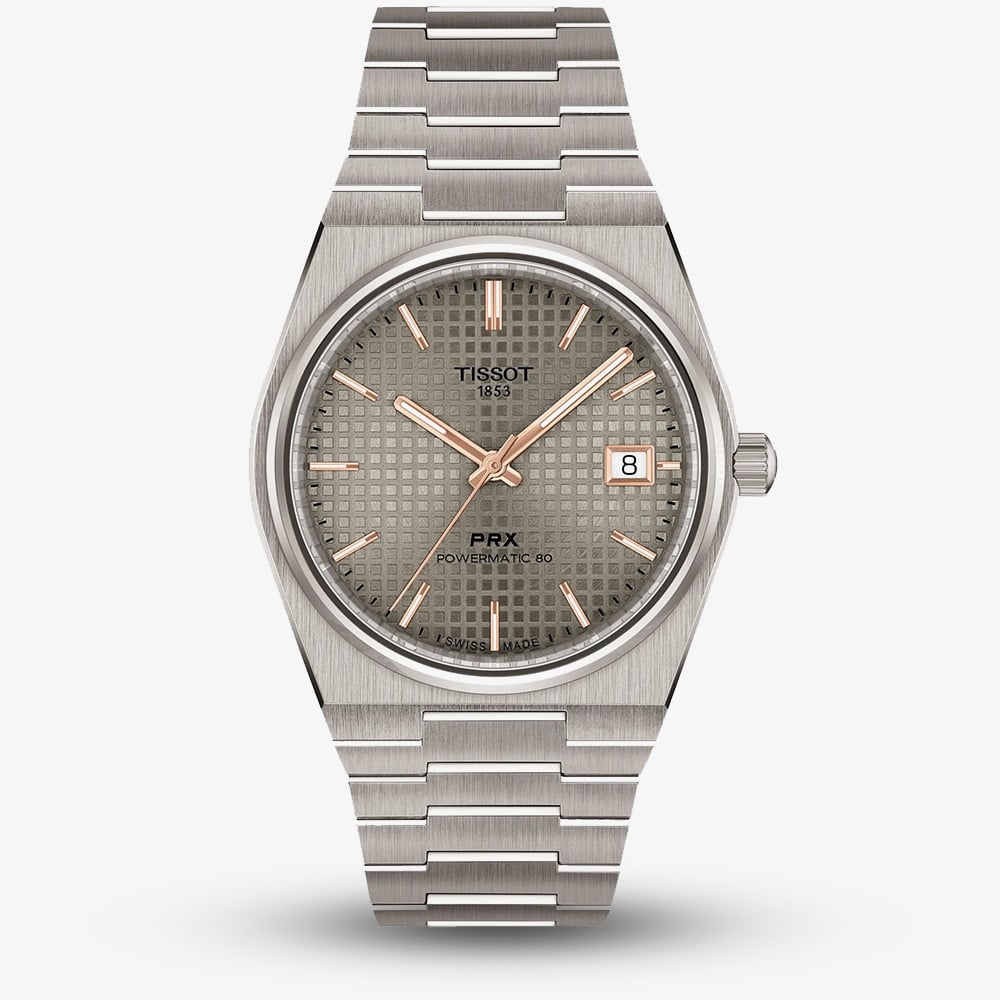 The Tissot PRX Titanium watch combines lightweight strength with sophisticated style. Featuring a sleek tonneau-shaped titanium case and matching bracelet, this timepiece showcases a refined grey dial with rose gold-tone hands and hour markers, along with a date display. Powered by the Powermatic 80 automatic movement with a Nivachron™ hairspring, it delivers exceptional precision, magnetic resistance, and an 80-hour power reserve.
