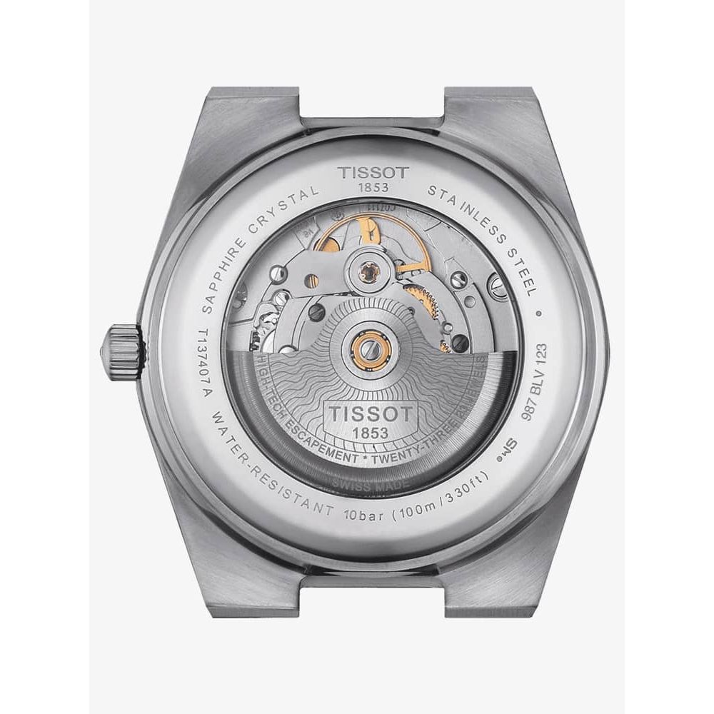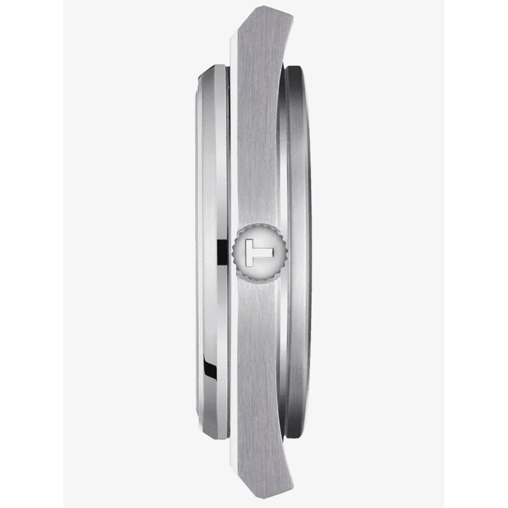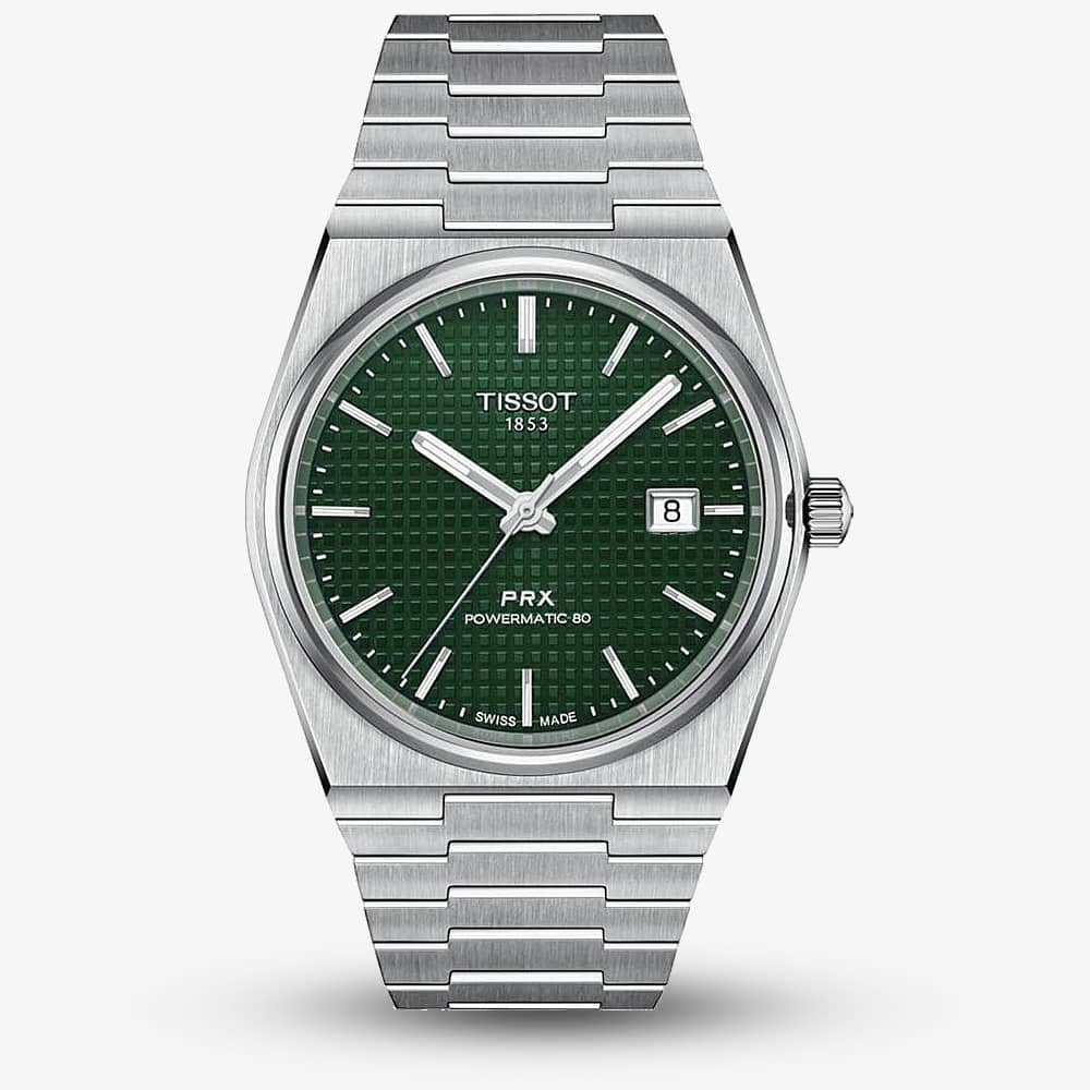 The Tissot PRX Powermatic 80 Automatic Green Watch T137.407.11.091.00 combines a 40mm round-shaped stainless-steel case and stainless-steel bracelet with a push button deployment clasp. The date is visible at position three with a silver border, protected beneath scratch-resistant sapphire crystal glass with an anti-reflective coating. Power is generated by the Swiss automatic movement with an approximate power reserve of up to 80 hours. This model also has a water resistance of up to 100 metres.