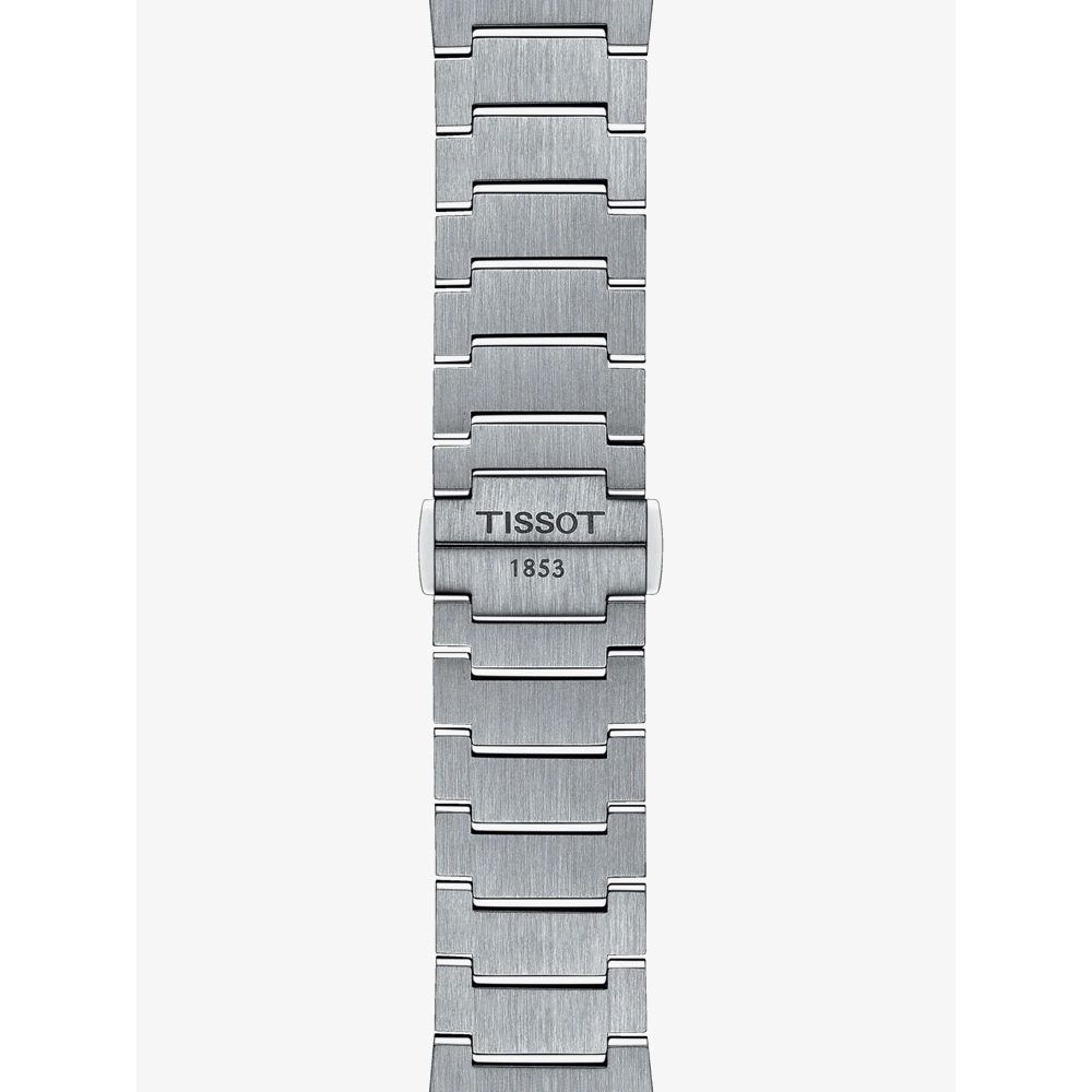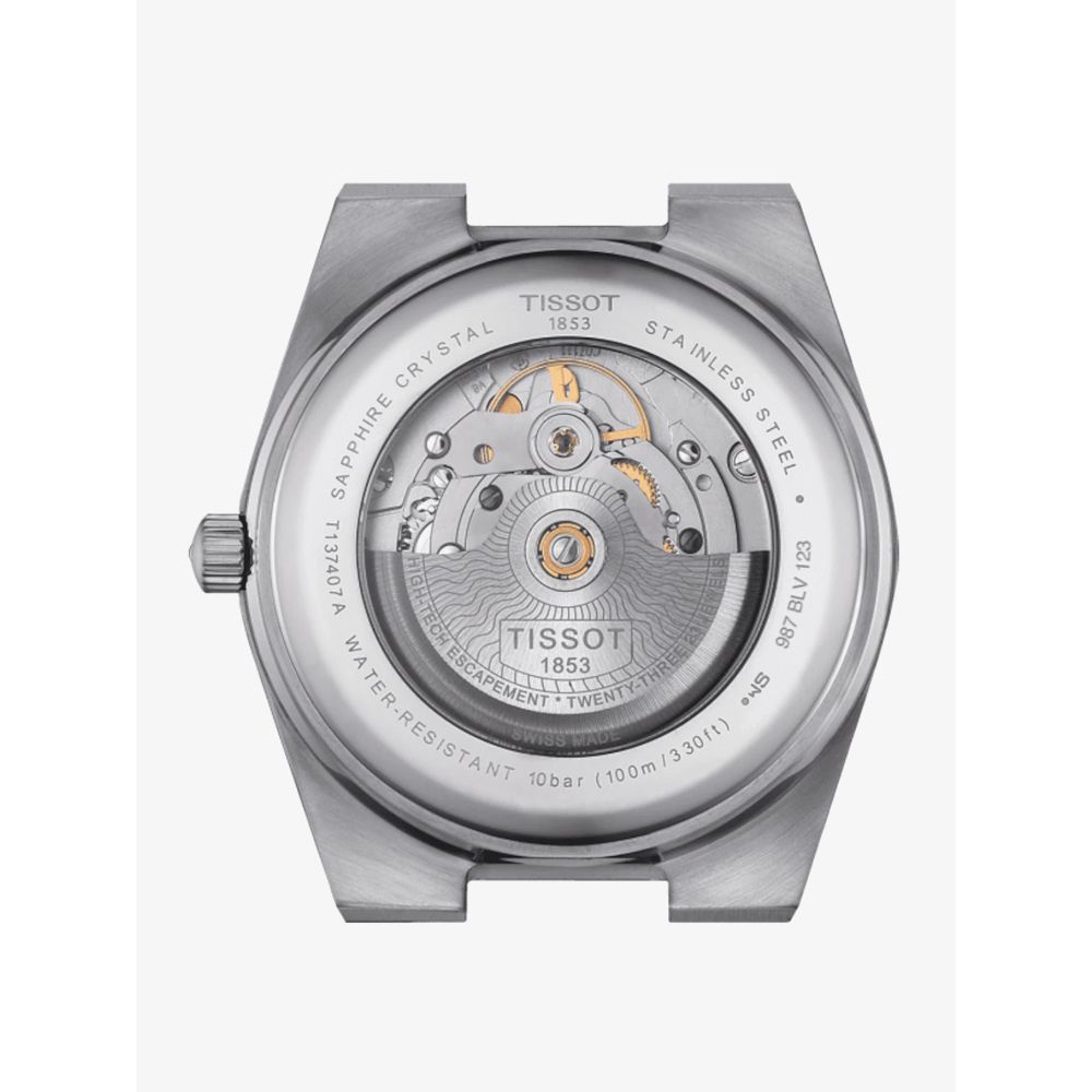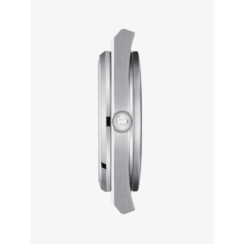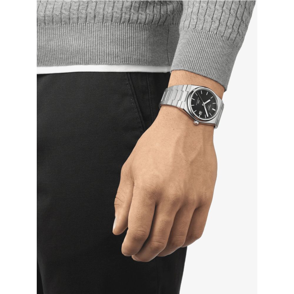 The Tissot T137.407.11.051.00 T-Classic watch combines a 40mm round-shaped stainless-steel case with a grey stainless-steel bracelet with a push-button deployment clasp. This watch features a black waffle design analogue dial with two silver luminescent hands and a silver second hand. The date is visible at position three with a silver border, which is protected beneath scratch-resistant sapphire crystal glass with an anti-reflective coating.