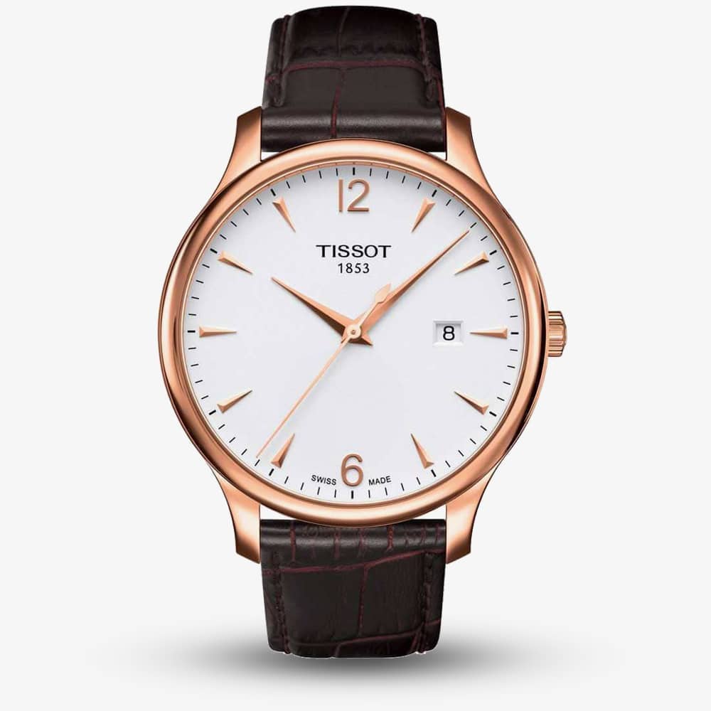 The round dial watch by Tissot is an elegant watch suitable for any occasion. The watch case is made from rose gold plated stainless steel and is attached to a brown leather strap. The white dial also features a date function.