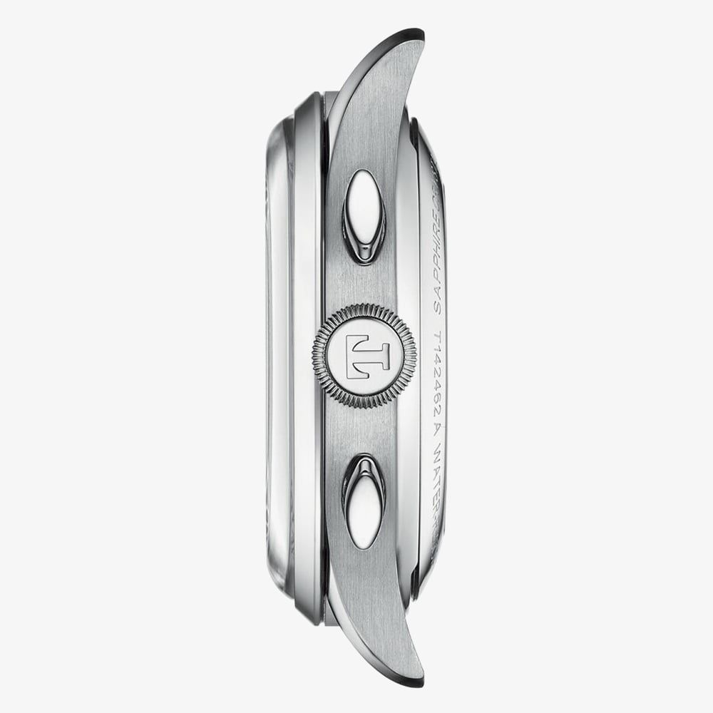 The Tissot Telemeter 1938 T142.462.16.032.00 is a stunning tribute to the golden era of sports timekeeping, reviving the aesthetic of a 1930s classic. Its 42mm stainless steel case houses a sophisticated silver dial adorned with two railroad sub dials, a telemeter scale, and a tachymeter. These intricate details, rendered with vintage precision, allow the wearer to measure distance and speed with a simple click of the ergonomic pushers. The domed sapphire crystal, treated with an anti-reflective coating, ensures the dial remains clear and legible under any lighting conditions.