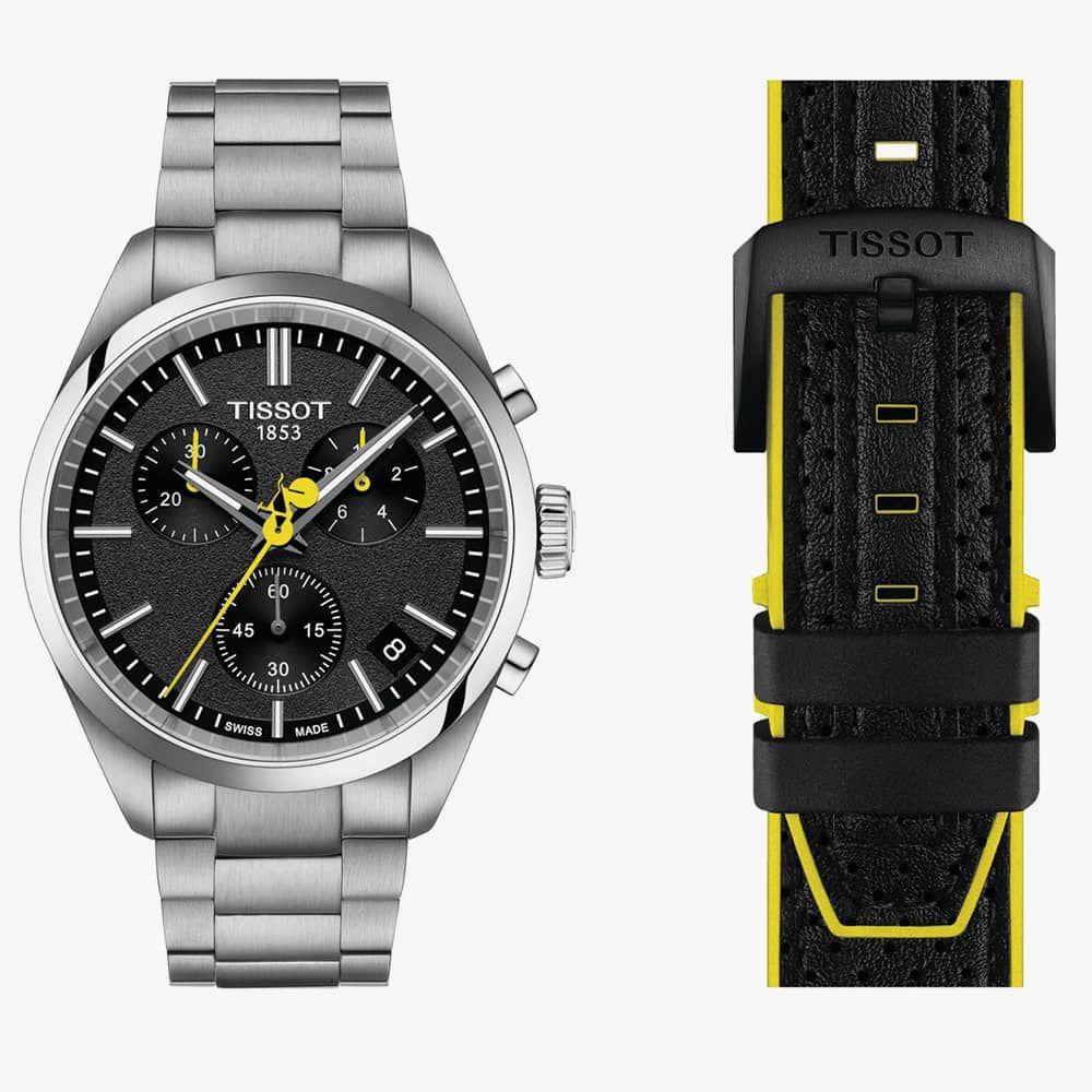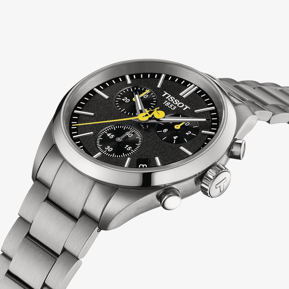 Tour de France takes over our PR 100 Chronograph collection! Featuring an asphalt-textured black dial inspired by the road and a bicycle-shaped second hand in the competition's iconic yellow, this exquisite timepiece is a must-have for cycling enthusiasts. Powered by the G10.212 chrono quartz movement, this watch offers precision and durability. The case back is engraved with the Tour de France's iconic logo. This versatile and durable PR 100 Chronograph includes a three-row metal bracelet with a butterfly buckle, along with an additional black bi-material strap inspired by bicycle handlebar grips.