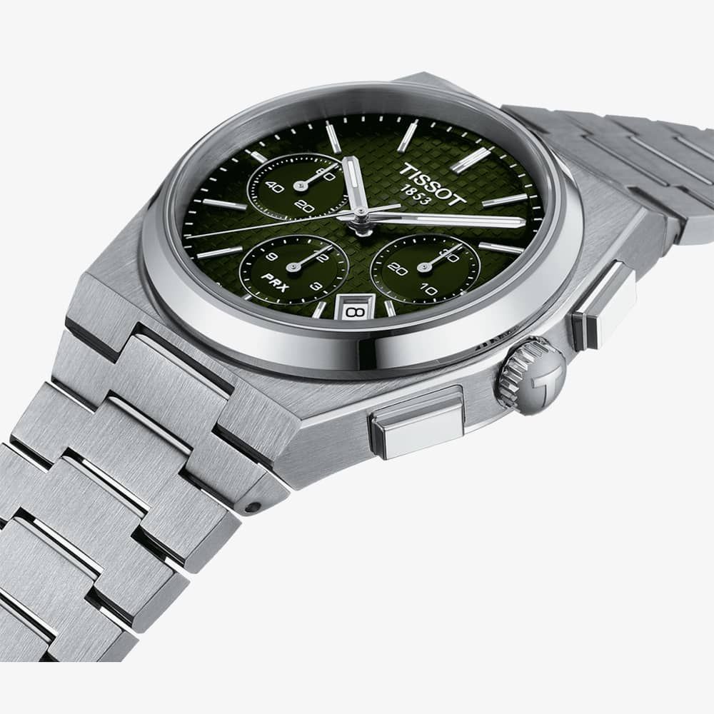 Crafted for those with a discerning eye for design and equipped with contemporary function, the Tissot PRX Chrono pays homage to the brand's iconic 1978 case shape. A coveted addition to any watch enthusiast's collection, this 42mm satin-finished steel timepiece stays true to the sleek, angular silhouette of the PRX series, staying true to the relaxed 1970s sports watch styling with its panda dial. Driving its performance is the Valjoux A05.H31 calibre, lending the watch its classic chronograph dial layout at 3, 6, and 9 o'clock, along with an impressive 60-hour power reserve. Explore this stylish and sporty rendition featuring a khaki green dial, coordinated counters, and a stainless steel bracelet.