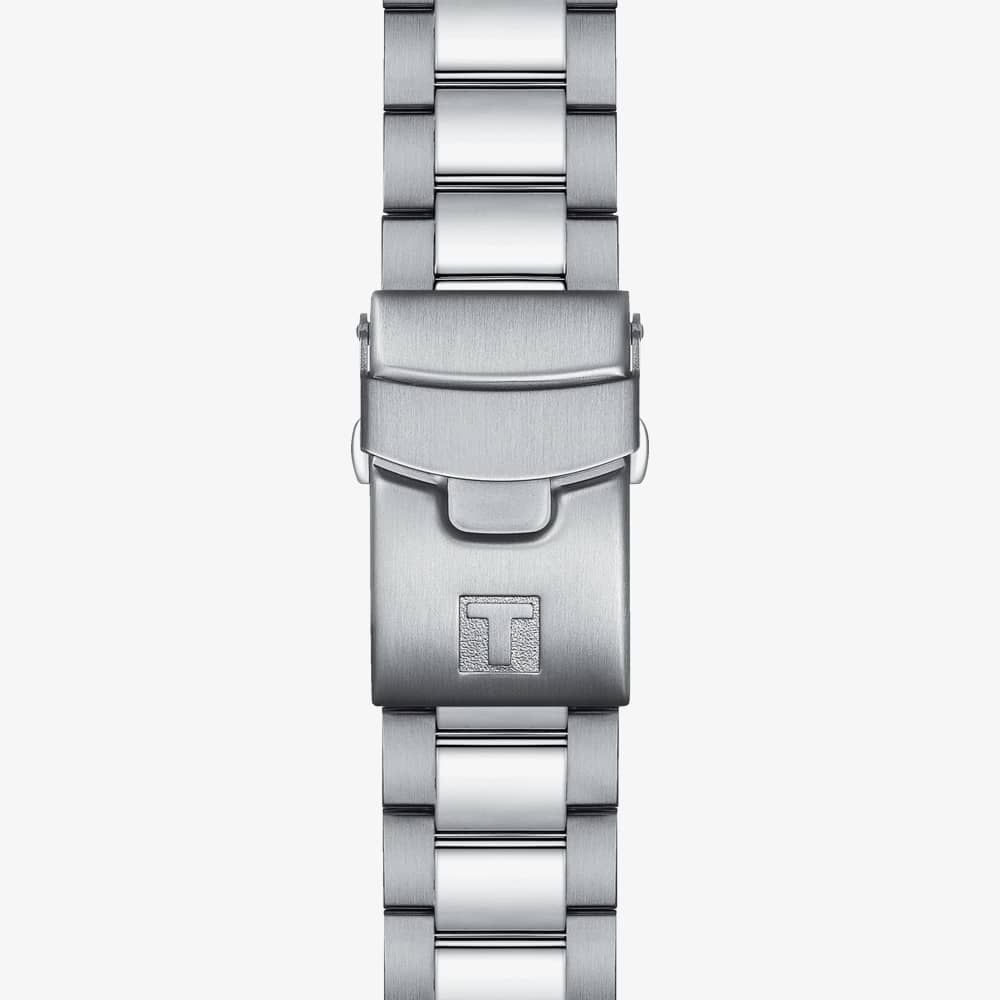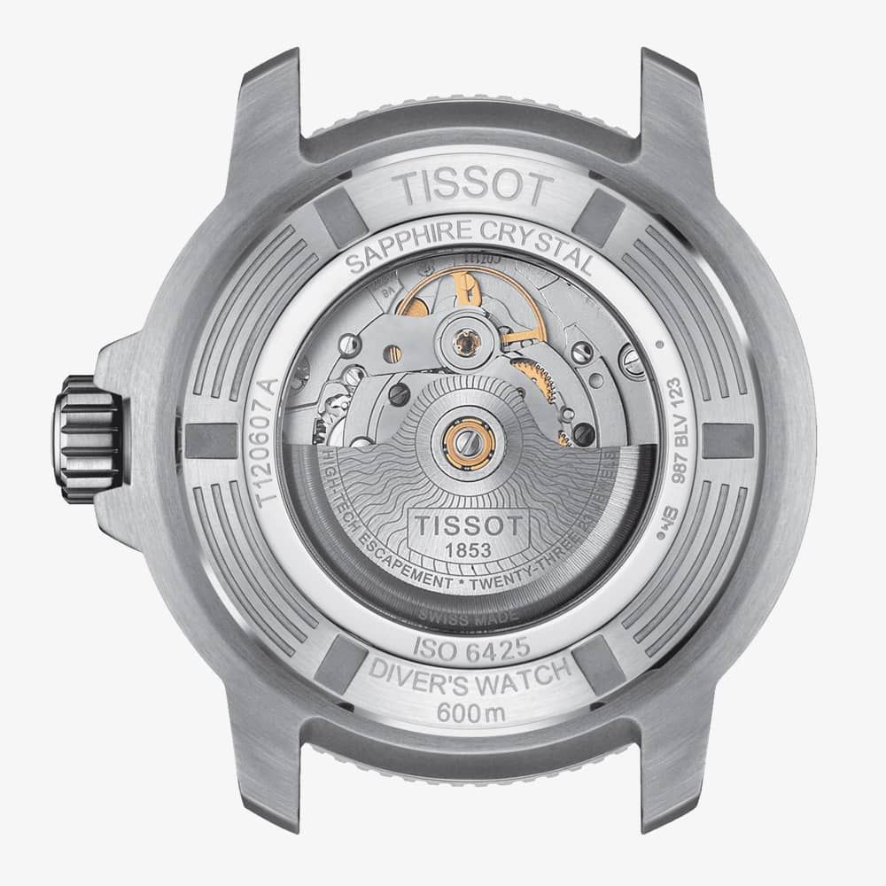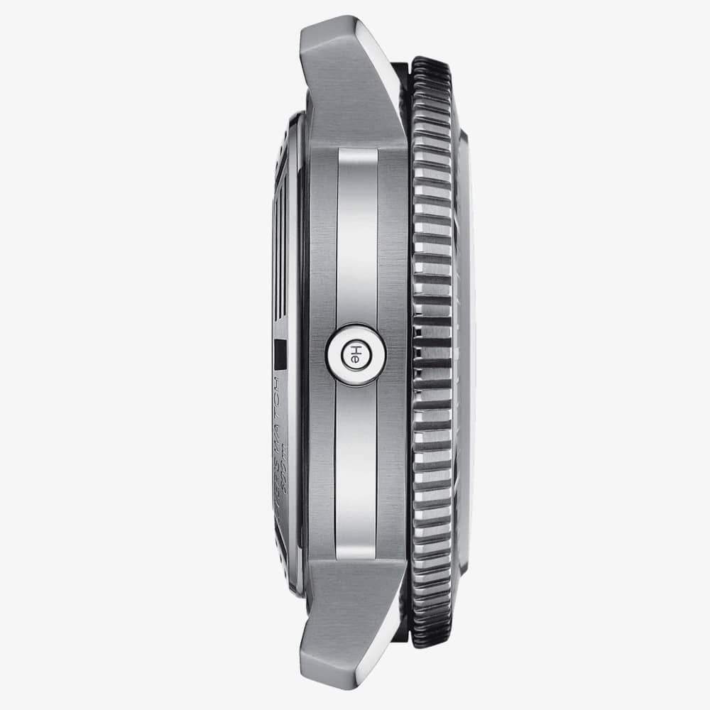 The Tissot Seastar 2000 Professional Powermatic 80 Watch T120.607.11.041.00 watch combines a 46mm round-shaped stainless steel case and a silver interchangeable stainless steel bracelet with a push button deployment clasp. It has a black-to-blue gradient dial with wave detailing. This diver’s watch features luminescent hands, a date display at position six with a silver border, protected beneath domed scratch-resistant sapphire crystal glass with an anti-reflective coating. Power is generated by the Powermatic automatic movement with an approximate power reserve of 80 hours. This model also has a water resistance of up to 600 metres.