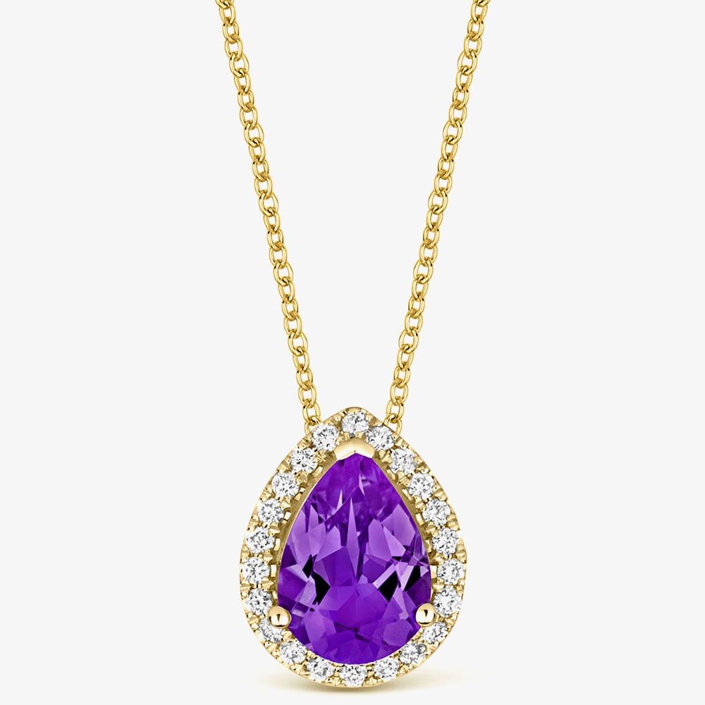 Crafted in luxurious 18ct rose gold, this stunning necklace showcases a pear-shaped amethyst pendant, known for its deep, captivating purple hue. A halo of brilliant diamonds surrounds the centre stone, adding sparkle and enhancing its natural beauty. A graceful and refined piece, perfect for adding a pop of colour and elegance to any outfit. Total gemstone weight: Amethyst 0.57ct.