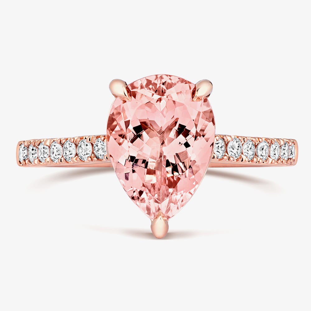 This sophisticated ring has been crafted from 18ct rose gold & features a beautiful three claw pear-cut Morganite stone with sparkling brilliant-cut diamond set shoulders. The perfect statement piece or ideal for layering & combining with other rings to create your own unique look. Gemstone Weights are Morganite 2.39ct.