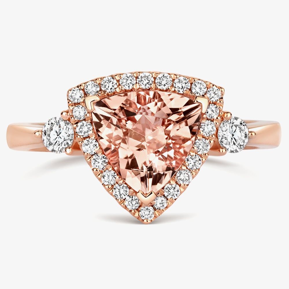 An eye-catching ring from Tivon which is sure to dazzle. This cluster ring has been elegantly created in 18ct rose gold and features a striking trillion-cut Morganite stone secured in a three-claw setting and is crafted with a frame of glittering diamonds and two round cut diamonds each side to complete the design perfectly. A phenomenal statement piece of jewellery to add to your collection.