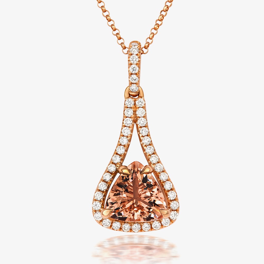 This eye-catching necklace has been crafted in 18ct rose gold & features a striking trillion-cut Morganite stone with a striking open tear-drop shape diamond set setting & pendant bale. This necklace is completed with an 18-inch 18ct rose gold chain. The perfect statement piece or ideal for layering & combining with other necklaces to create your own unique look. Gemstone & Diamond Weights are Morganite 5.11ct Diamonds 0.42ct.