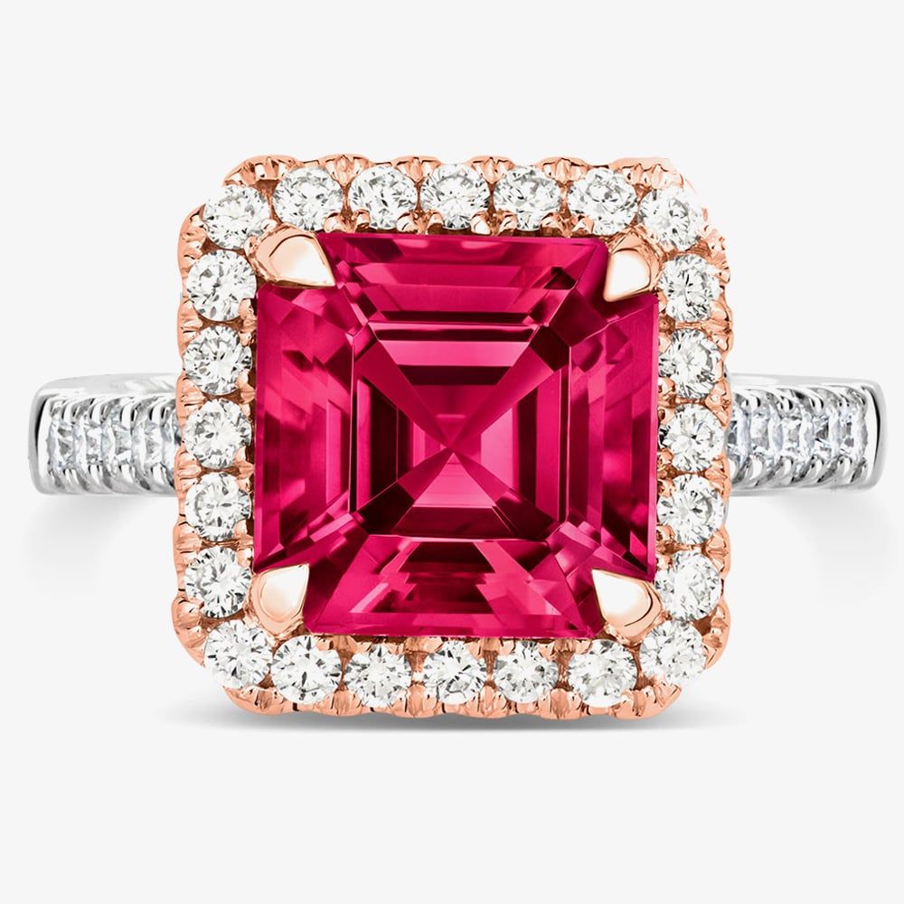 A magnificent ring from Tivon which is sure to be a showstopper. This cluster ring has been expertly created in 18ct white gold and features a striking Asscher-cut pink Tourmaline stone with a beautiful frame of glittering round cut diamonds which have been crafted in a warming 18ct rose gold claw setting. A true statement piece of jewellery to add to your collection.
