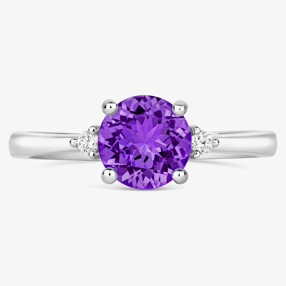 Crafted in luminous 18ct white gold, this timeless ring showcases a vibrant round amethyst at its centre, celebrated for its rich violet hue. Flanked by two sparkling round diamonds on, the design exudes classic elegance with a touch of modern charm. A beautifully balanced piece—perfect for both everyday luxury and special occasions. Total gemstone weight: Amethyst 0.95ct.