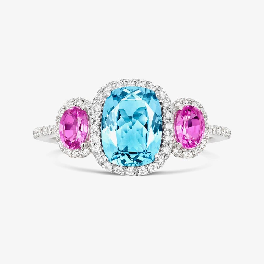 This exquisite ring features a stunning cushion-cut aquamarine and two deep pink sapphires, beautifully complemented by sparkling diamonds set in a polished 18-carat white gold band. The harmonious blend of cool blue tones and brilliant diamonds creates a captivating and sophisticated design.