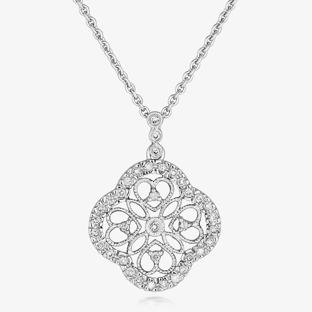 This contemporary ornate necklace has been crafted in 18ct white gold & features eye-catching brilliant cut diamonds in an open quatrefoil fancy design. This necklace is completed with an 18-inch 18ct white gold chain. The perfect statement piece or ideal for layering & combining with other necklaces to create your own unique look.