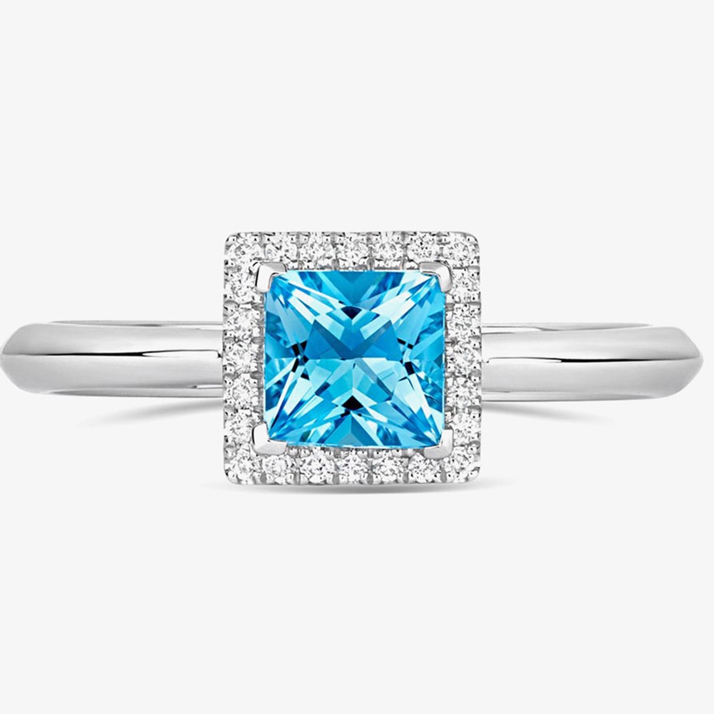 Featuring a stunning princess-cut blue topaz gemstone , this exquisite ring is set in a sleek 18-carat white gold band that beautifully enhances the stone’s vibrant, icy-blue sparkle. With its modern design and brilliant craftsmanship, this ring is perfect for adding a touch of sophistication to any outfit—whether for everyday wear or special occasions. A timeless piece that combines contemporary style with classic beauty.