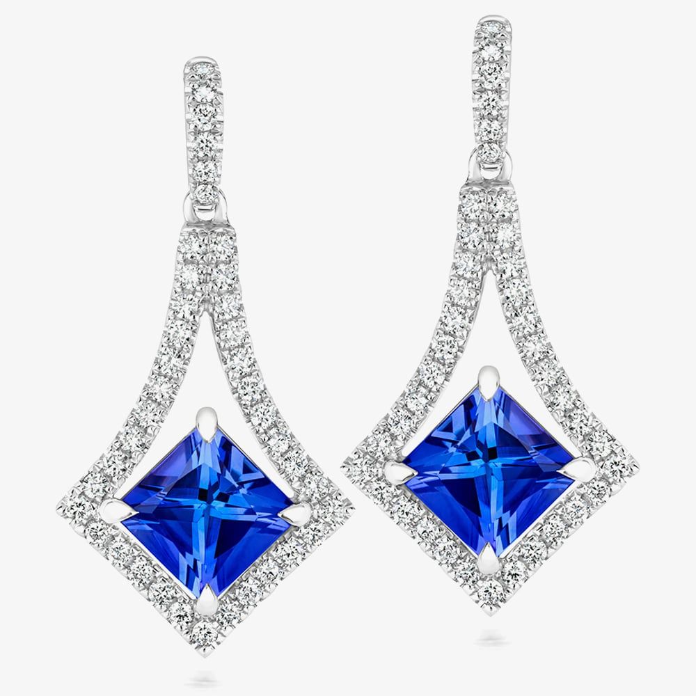 These elegant dropper earrings have been crafted in 18ct white gold & feature a striking princess-cut blue Tanzanite centre stone with a sparkling diamond set open surround design. The perfect statement piece or ideal for layering & combining with other earrings to create your own unique look. Gemstone & Diamond Weights are Total Tanzanite Total 2.55ct Diamonds Total 0.70ct.