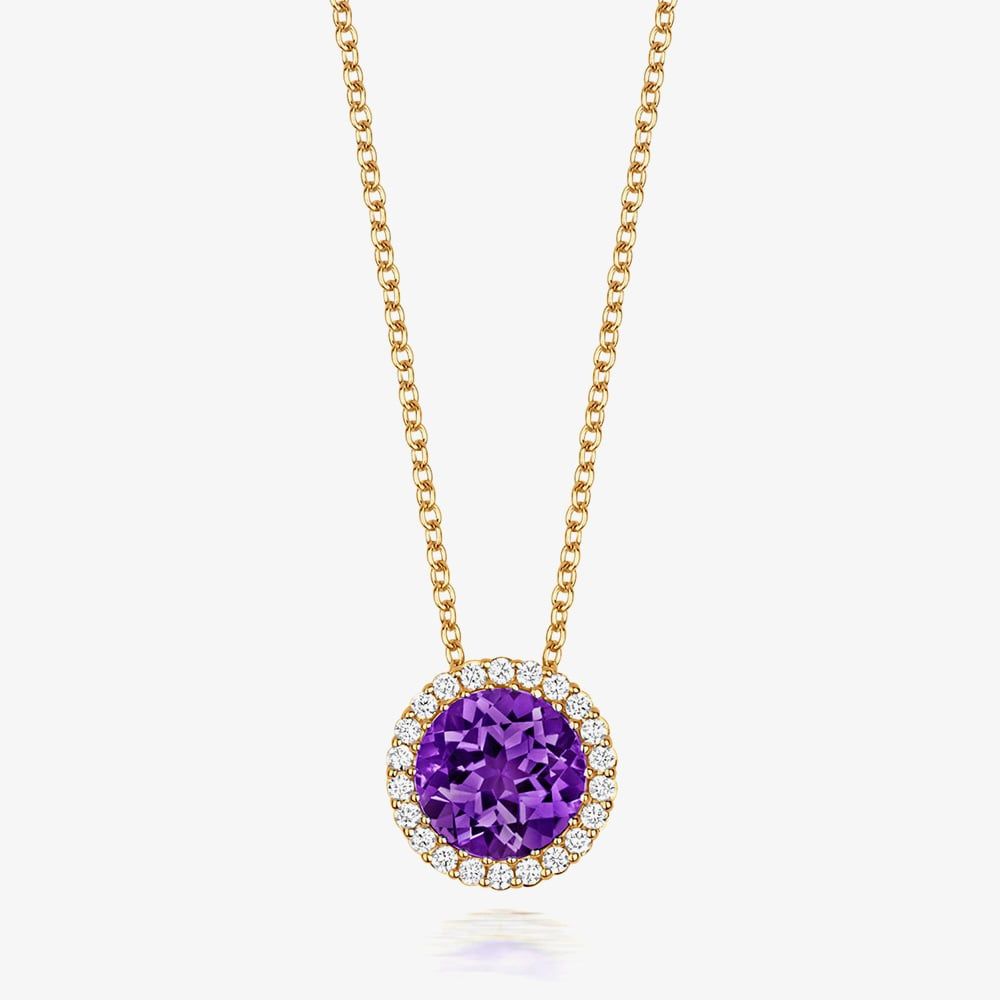 This graceful pendant features a vivid brilliant-cut amethyst, renowned for its deep purple hue and luminous brilliance, securely set in luxurious 18ct yellow gold. Delicately accented with sparkling white diamonds, the pendant captures and reflects light with every movement, creating a captivating shimmer that enhances the beauty of the central gemstone. Suspended from a matching gold chain, this piece blends timeless design with modern sophistication.