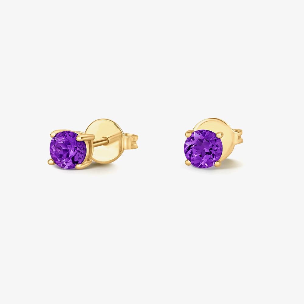 Crafted from rich 18-carat yellow gold, these stunning stud earrings showcase brilliantly cut amethyst gemstones, securely held in place by a classic four-claw setting. The vibrant purple amethyst gemstones shimmer with exceptional clarity and depth, beautifully contrasting against the warm glow of the yellow gold.