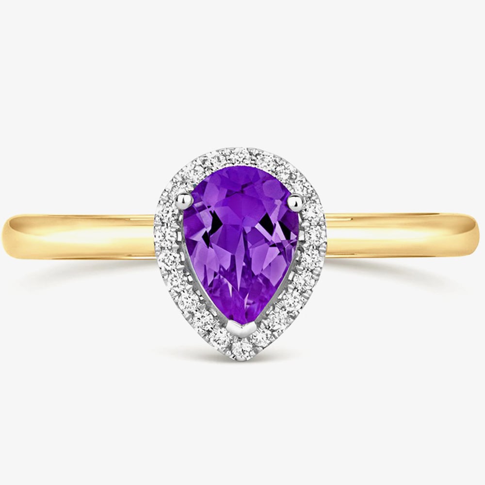 This exquisite ring features a radiant pear-cut amethyst gemstone, known for its rich purple hue and elegant shape, beautifully accented by sparkling diamonds that add a touch of brilliance and sophistication. Set in warm 18-carat yellow gold, the design combines classic luxury with contemporary style.