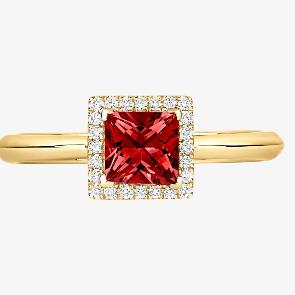 This striking ring features a vibrant princess-cut garnet gemstone set in a polished 18-carat yellow gold band. The rich, deep red of the garnet beautifully contrasts with the warm glow of the gold, creating a captivating and elegant look.