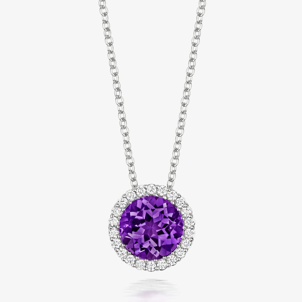 This traditional necklace has been crafted in 18ct white gold & features a round Amethyst stone with a brilliant-cut diamond halo surround. This necklace is completed with an 18-inch 18ct white gold chain. The perfect statement piece or ideal for layering & combining with other necklaces to create your own unique look. Gemstone & Diamond Weights are Amethyst 0.71ct Diamond 0.07ct.