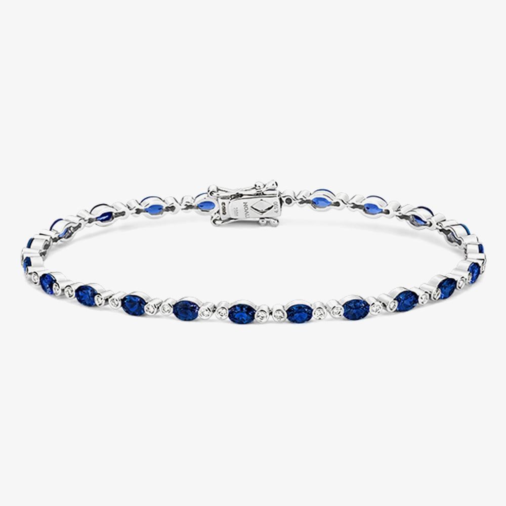 This classic Heirloom bracelet has been crafted in 18ct white gold & features an alternating pattern of striking oval cut blue Sapphire stones & two rub over set diamonds in between. This bracelet has been completed with an open box clasp with two figure of eight safety catches. The perfect statement piece or ideal for layering & combining with other bracelets to create your own unique look. Gemstone Weights are Sapphires Total 4.60ct.