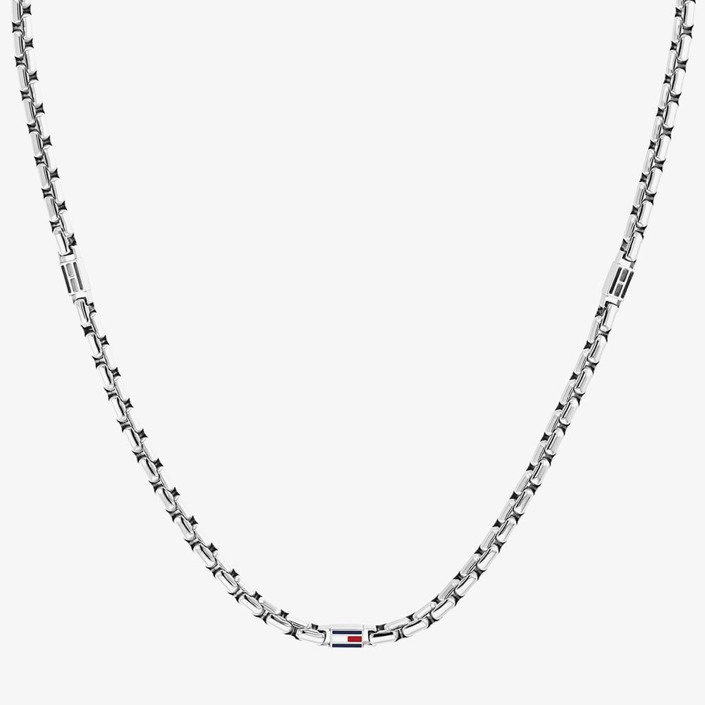 Bold and fashion-forward, the Tommy Hilfiger Men’s Necklace from the 3D Flag Metal collection features a silver stainless steel 22 inch box chain accented with distinctive skeleton flag branding. Finished with a secure lobster clasp, this cool, contemporary necklace adds a confident edge to modern menswear styling.